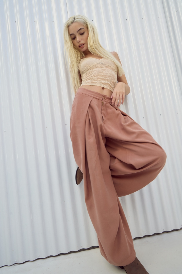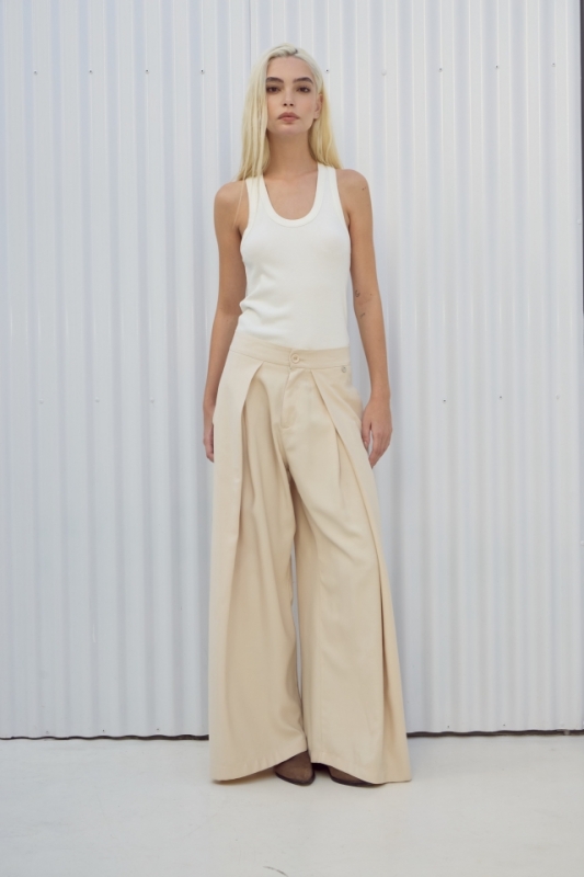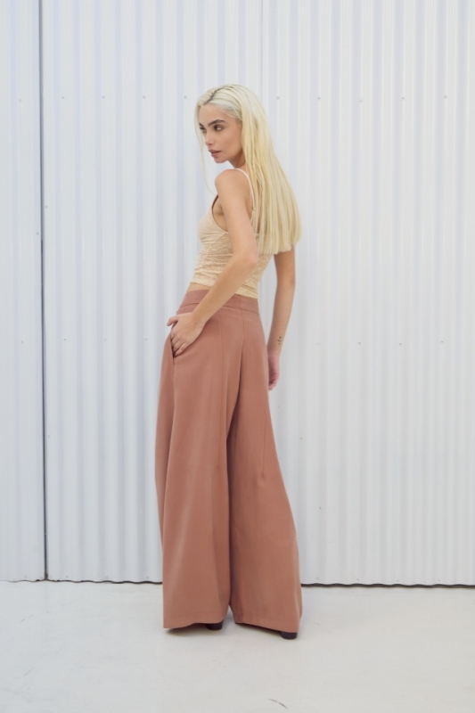 Pantalón confeccionado en Tencel, con acceso con cierre y botón al tono. Tiene tablones en delantero que generan volumen a la pierna y chapita metálica con identificación de marca. Composición: 90% Rayón 10% Poliéster