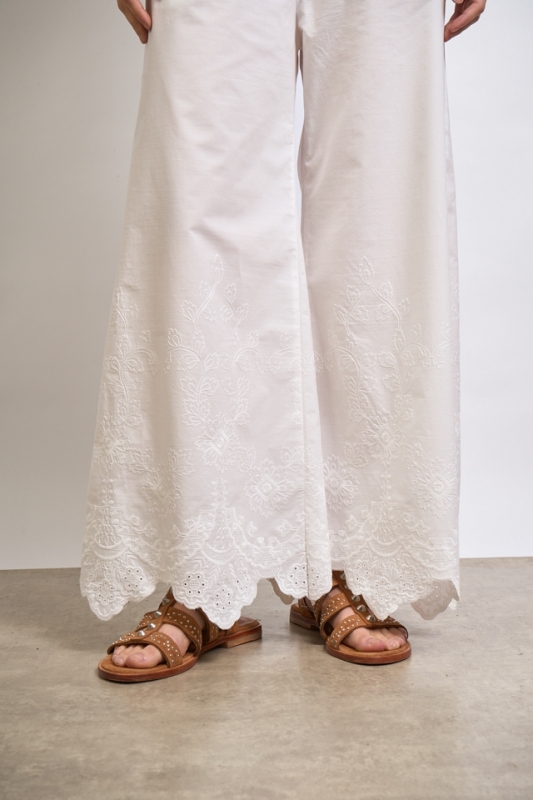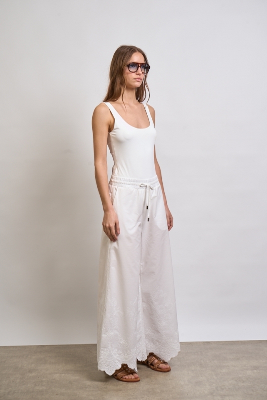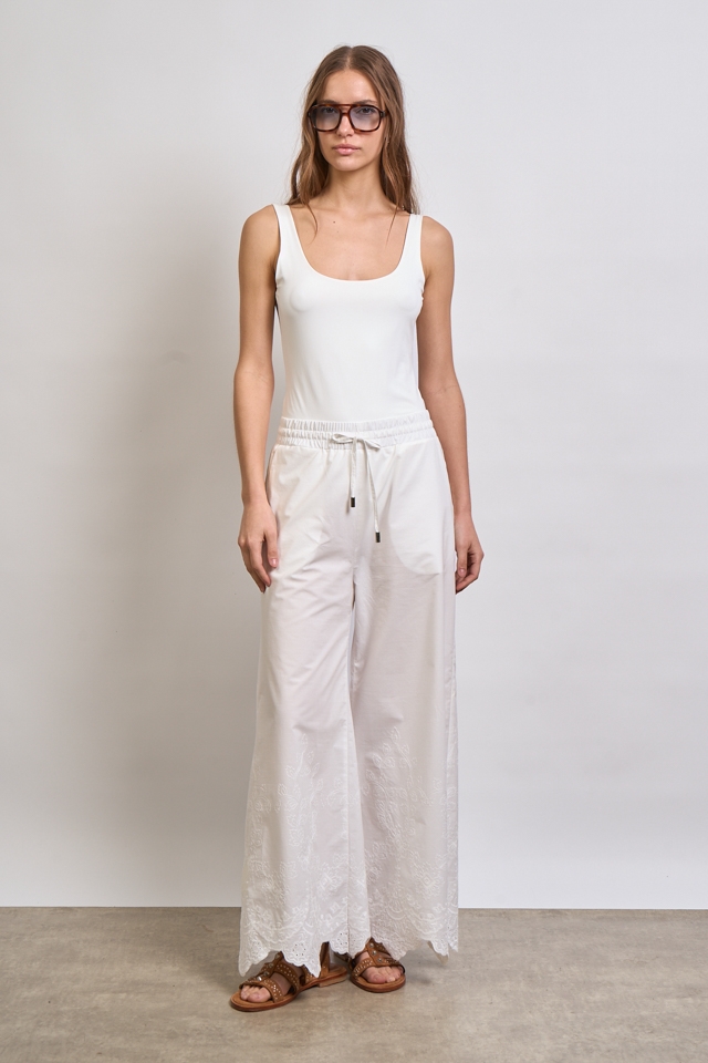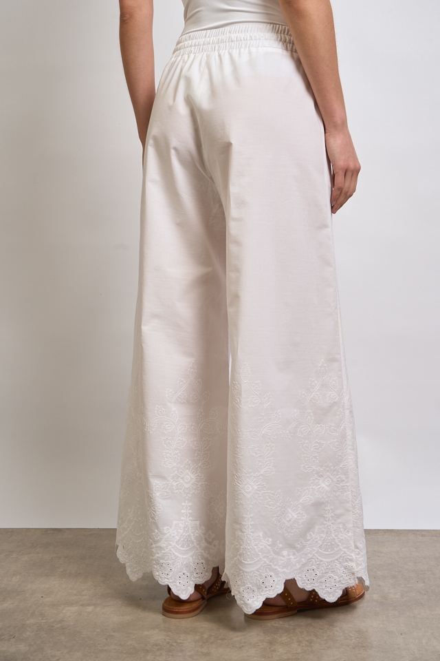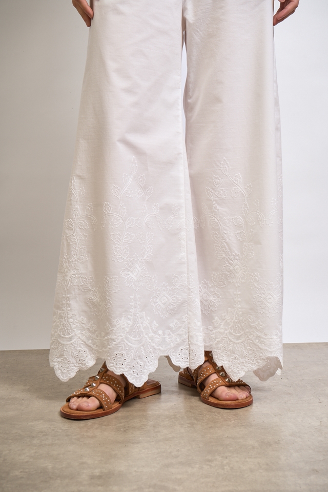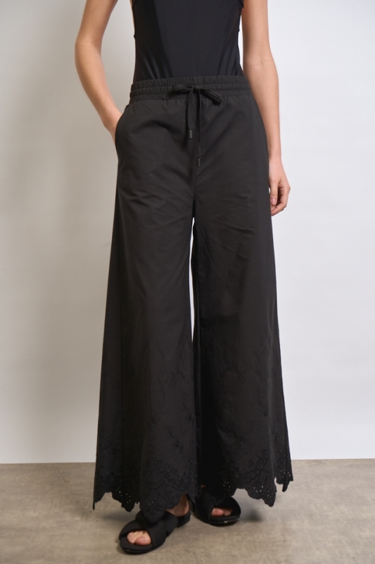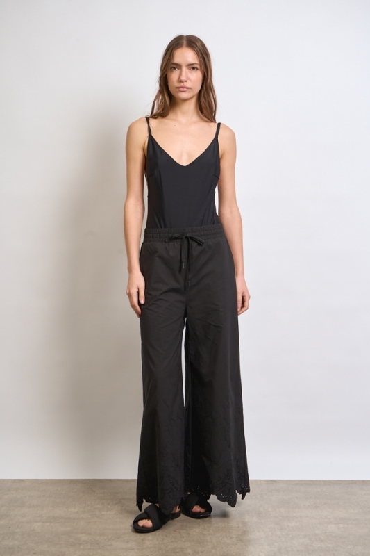 Pantalón de broderie corte clásico con elástico en cintura, la misma se complementa con una piola que lleva terminales con la identificación de marca. Posee bolsillos laterales y en el ruedo la tela se caracteriza por tener una guarda.