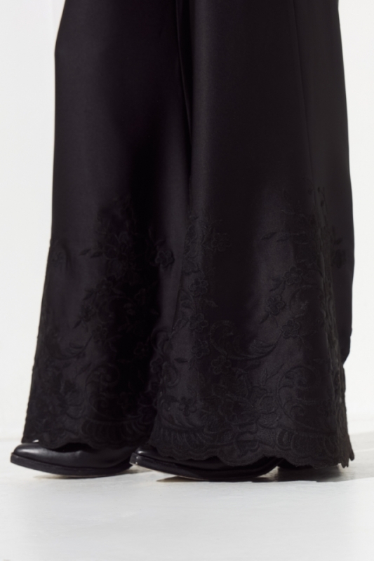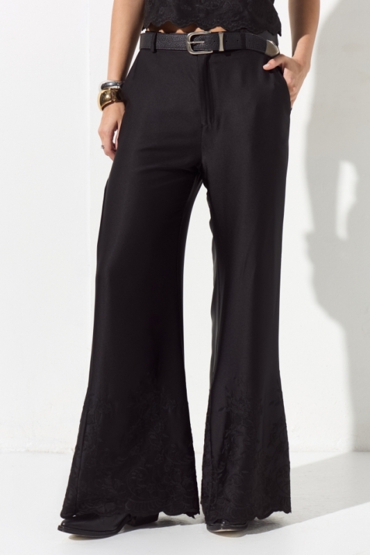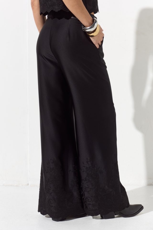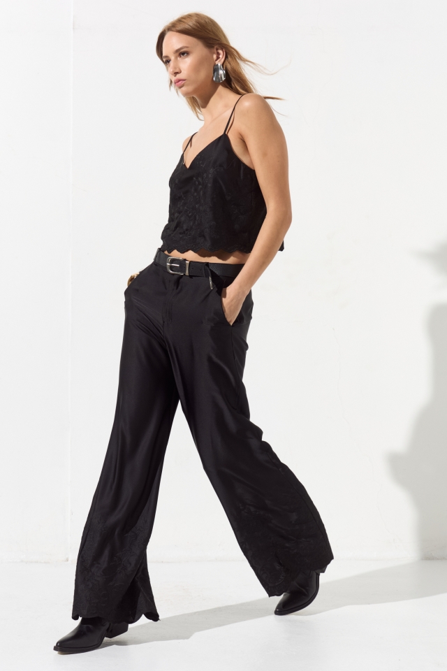 Pantalón sastrero de sedita con guarda bordada en botamanga.