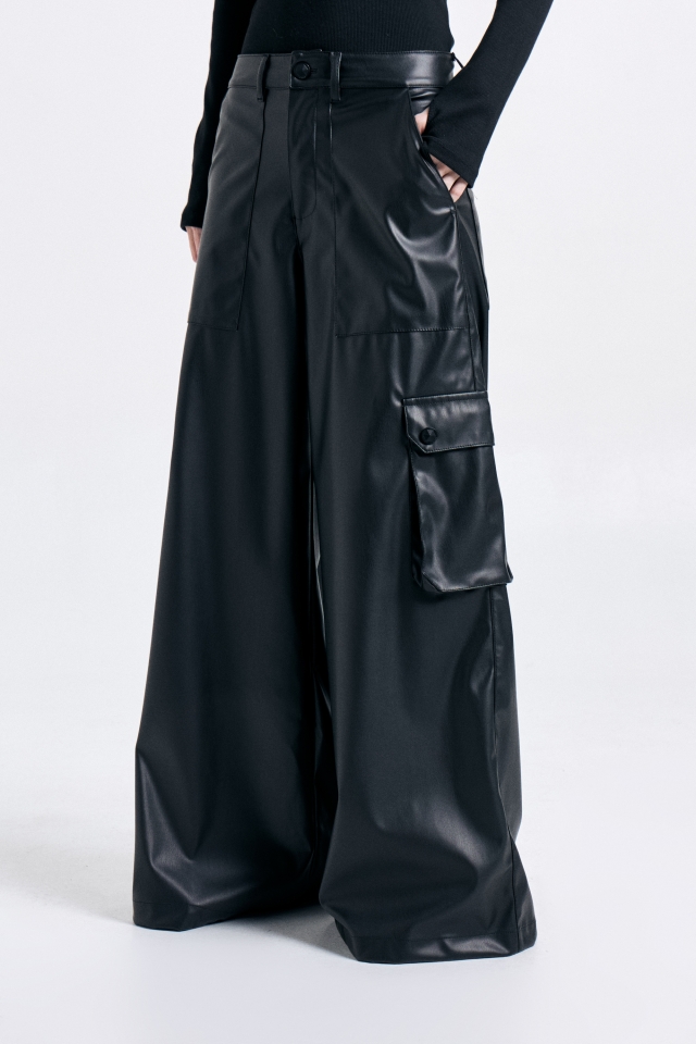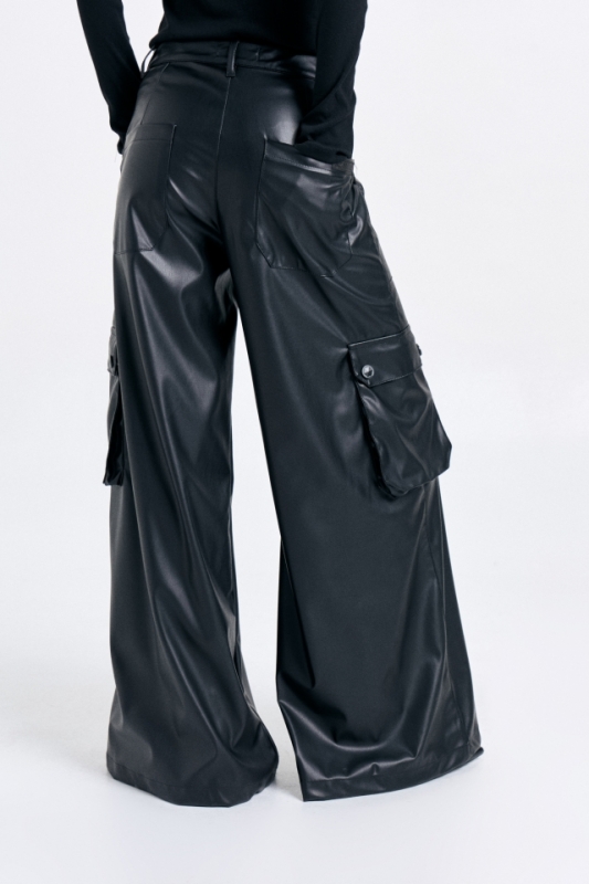 Pantalón pierna ancha, confeccionado en ecocuero, con 4 bolsillos delanteros, de estilo cargo y 2 bolsillos plaqué traseros. Lleva badana de marca en bolsillo trasero izquierdo. Composición- 45% PU 50 % Poliéster 5 % Spandex