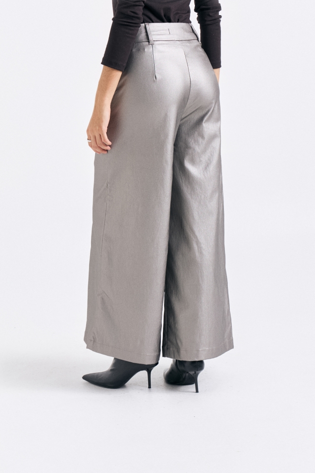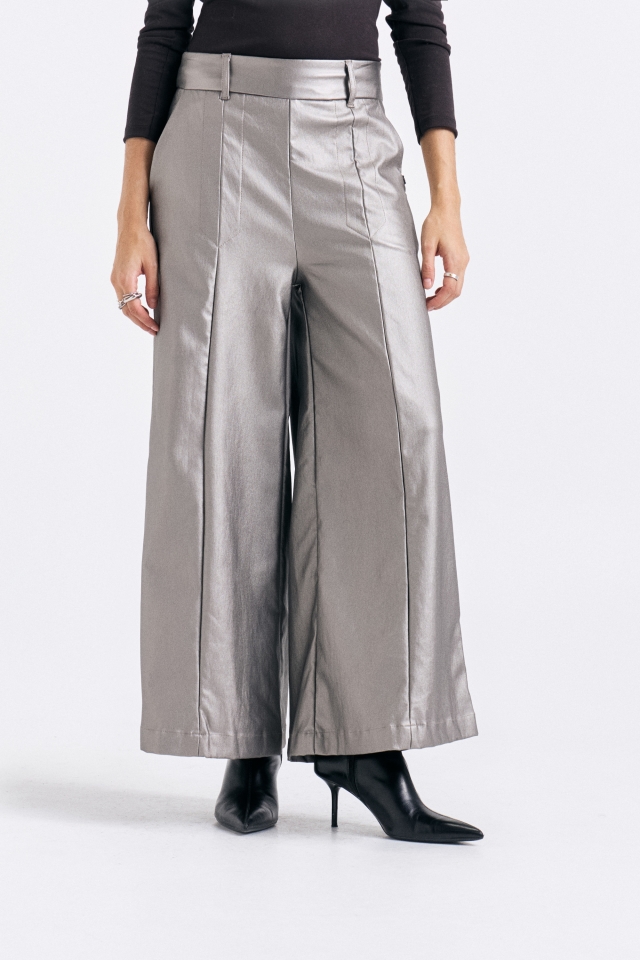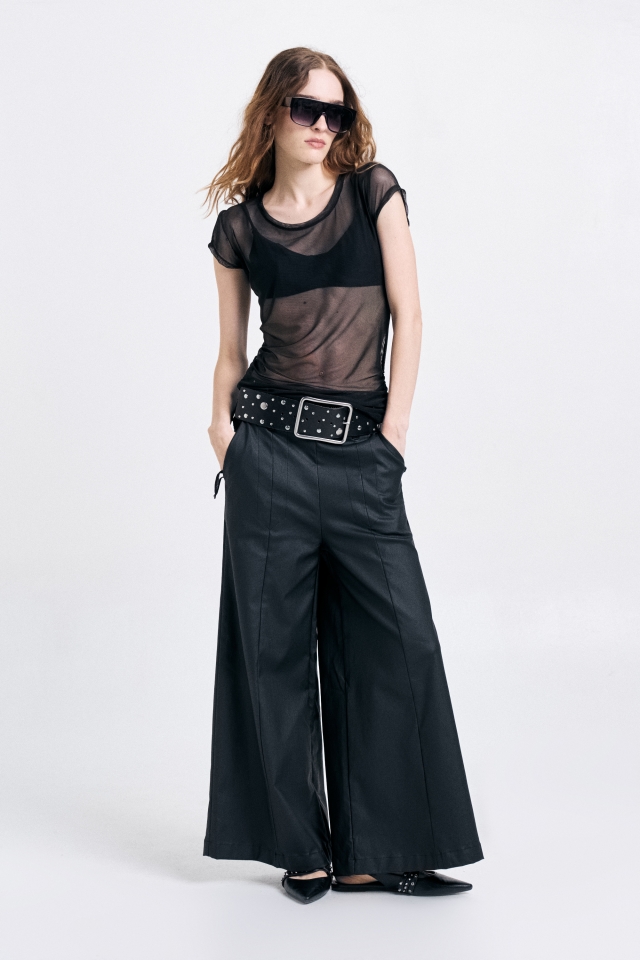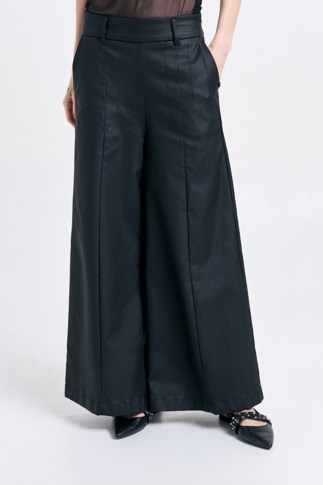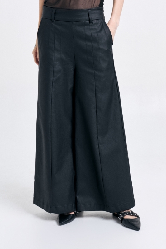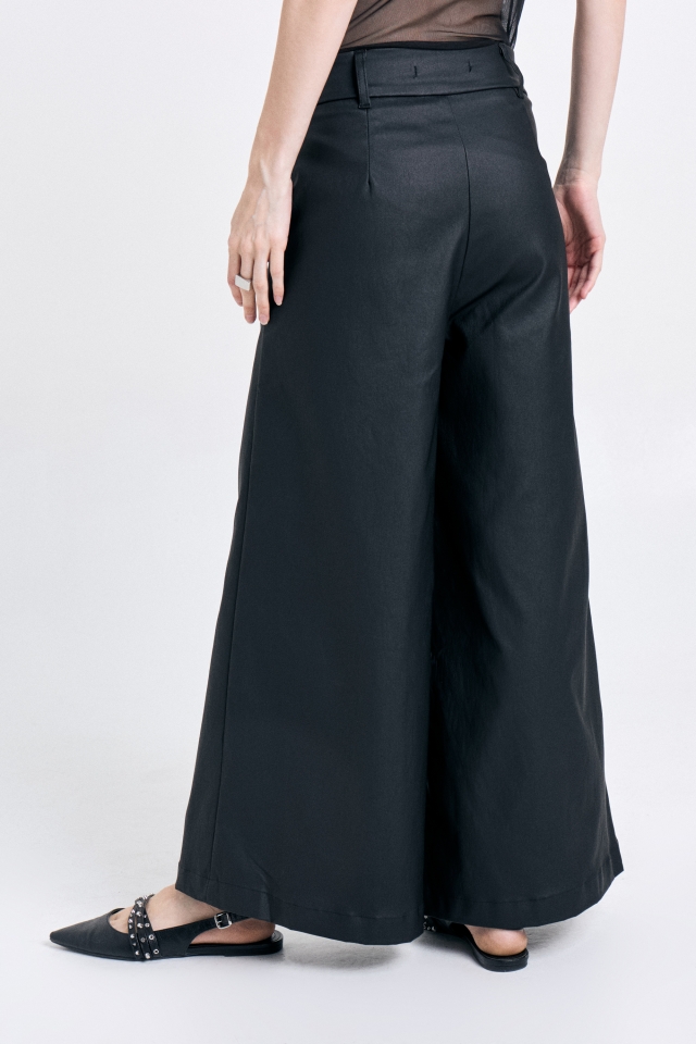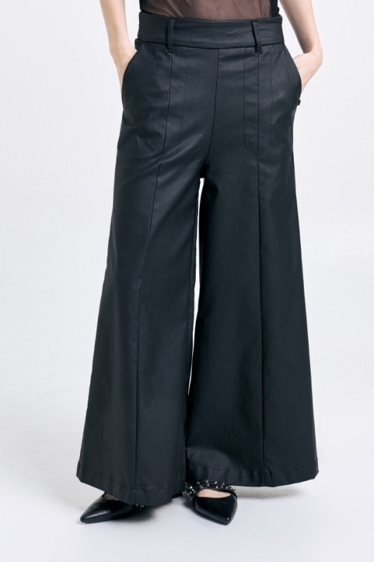 Pantalón pierna ancha, con recortes delanteros y largo al tobillo. Confeccionado en bengalina. Avíos personalizados.Composición: 51% poliéster 49% PU
