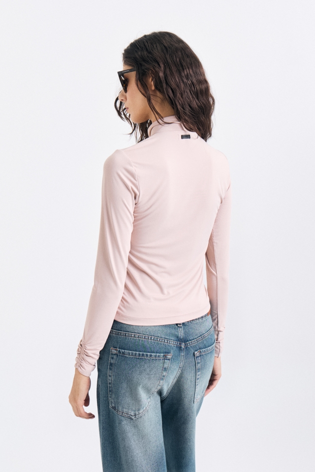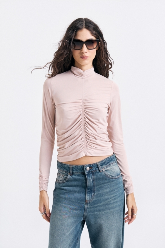 Polera manga larga de microfibra con frunce en delantero y mangasComposición 98% Algodón 2% Lyocell