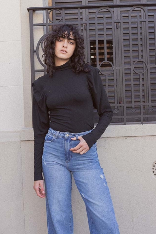 Polera manga larga de morley con detalle de volado en manga y etiqueta de goma en espalda.Composición: 93% rayón / 7% Spandex.