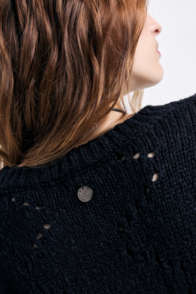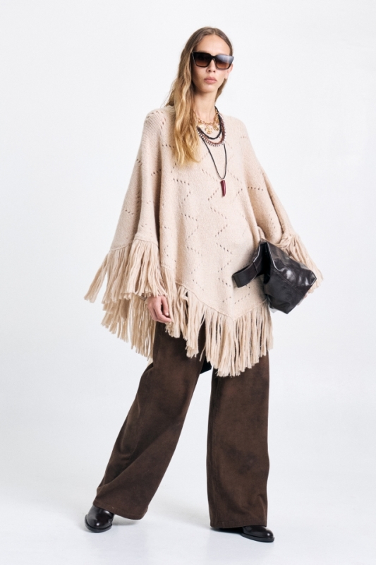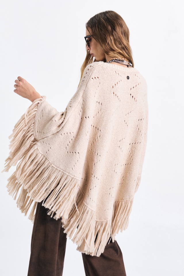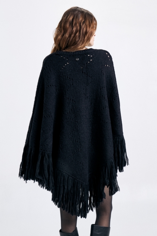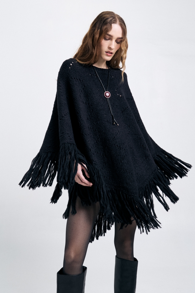 Poncho tejido de escote redondo con flecos en su recorrido inferior. Tiene grifa metálica con identificación de marca. Composición: 78% acrílico 10% nylon 10% lana 2% spandex HECHO EN CHINA