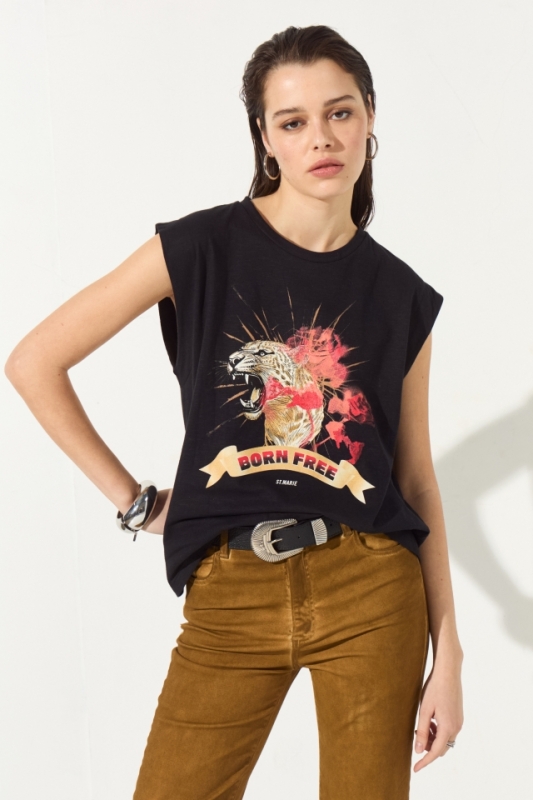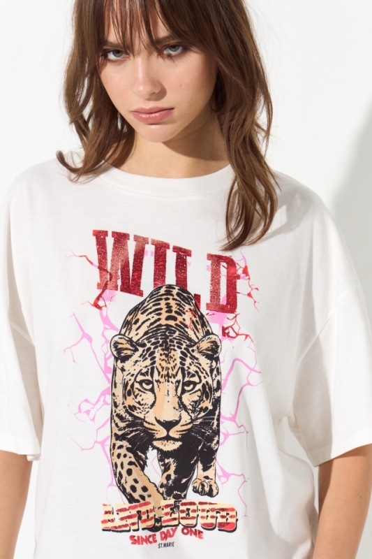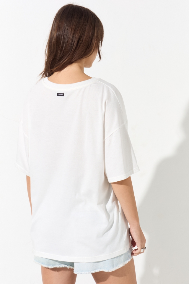 Remera estampada de corte clásico, lleva un escote redondo y zócalo en sus mangas. En el centro de la espalda lleva una grifa con la identificación de la marca.