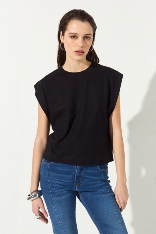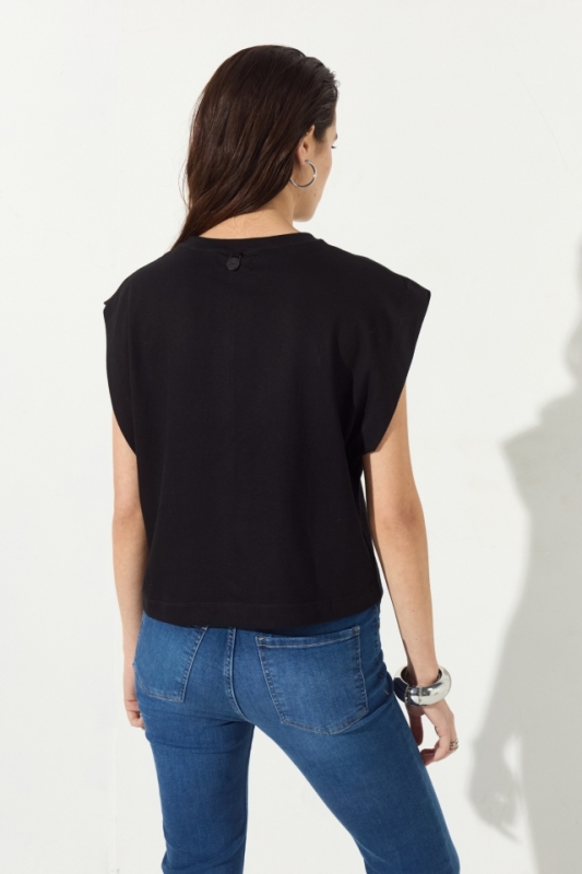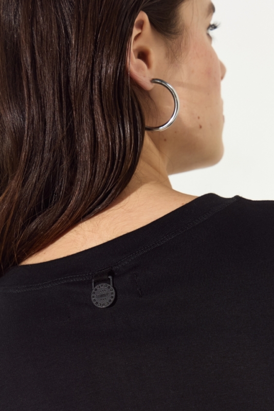 Remera confeccionada en jersey, de calce relajado con hombros prolongados que terminan en amplia sisa. Además tiene grifa metálica con identificación de marca en escote espalda.