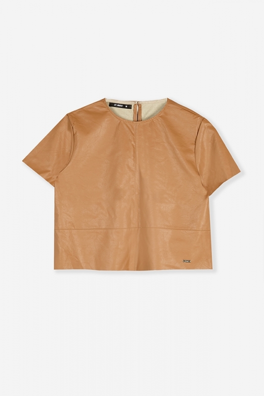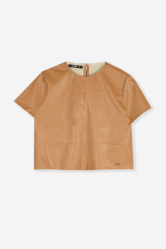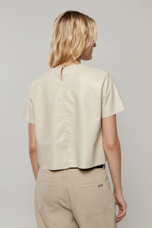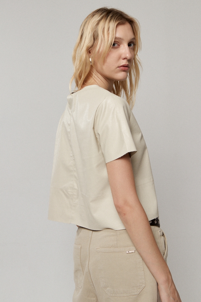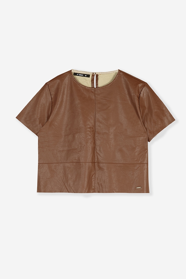 Remera de cuerina, manga corta con recortes en el frenteComposición: 100% PU.Cuidados: Lavar a mano del revés con agua fria, no planchar.