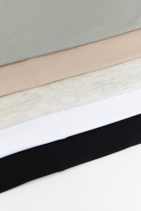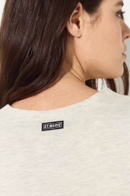 Remera de jersey algodón con lycra, de calce al cuerpo y largo por encima de cadera. Tiene escote a la base y hombros caídos. En centro espalda tiene pequeña badana con identificación de marca.