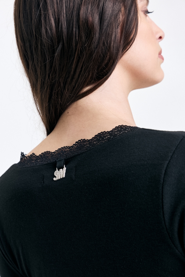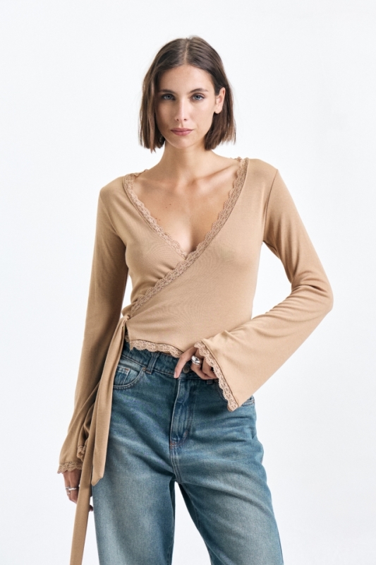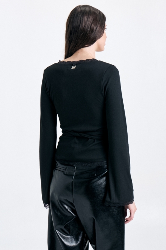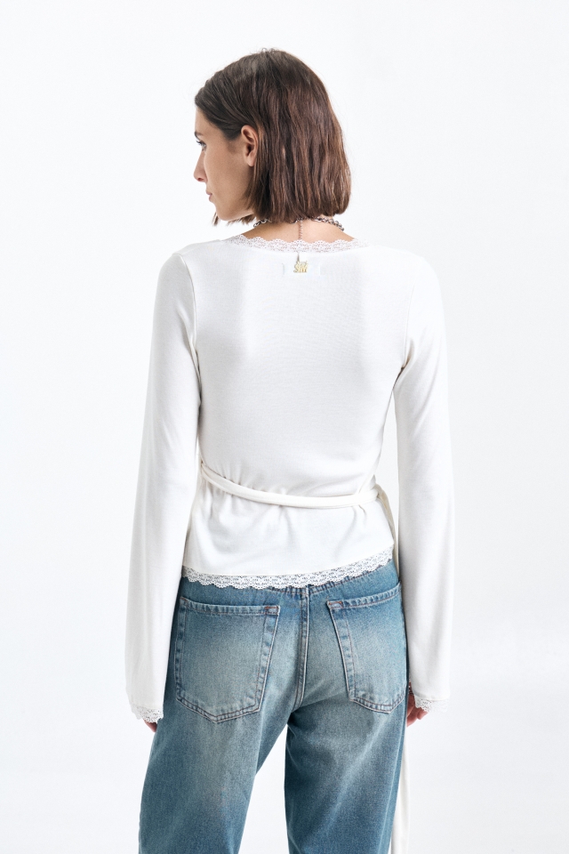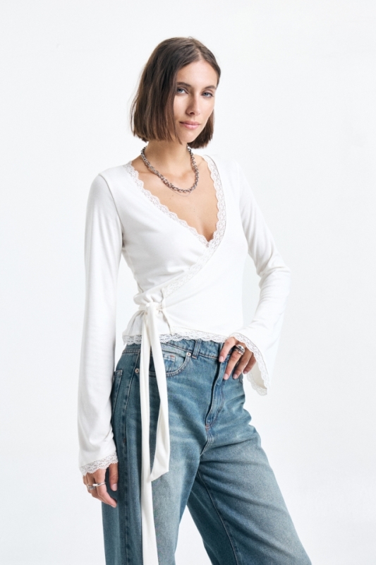Remera de lanilla cruzada, detalle de puntilla en escote, ruedo y puño de manga. Su cruce se da mediante un lazo confeccionado en la misma tela. Mangas acampanadas. Detalle de colgante de marca en centro espalda.
