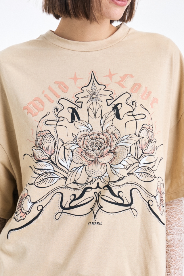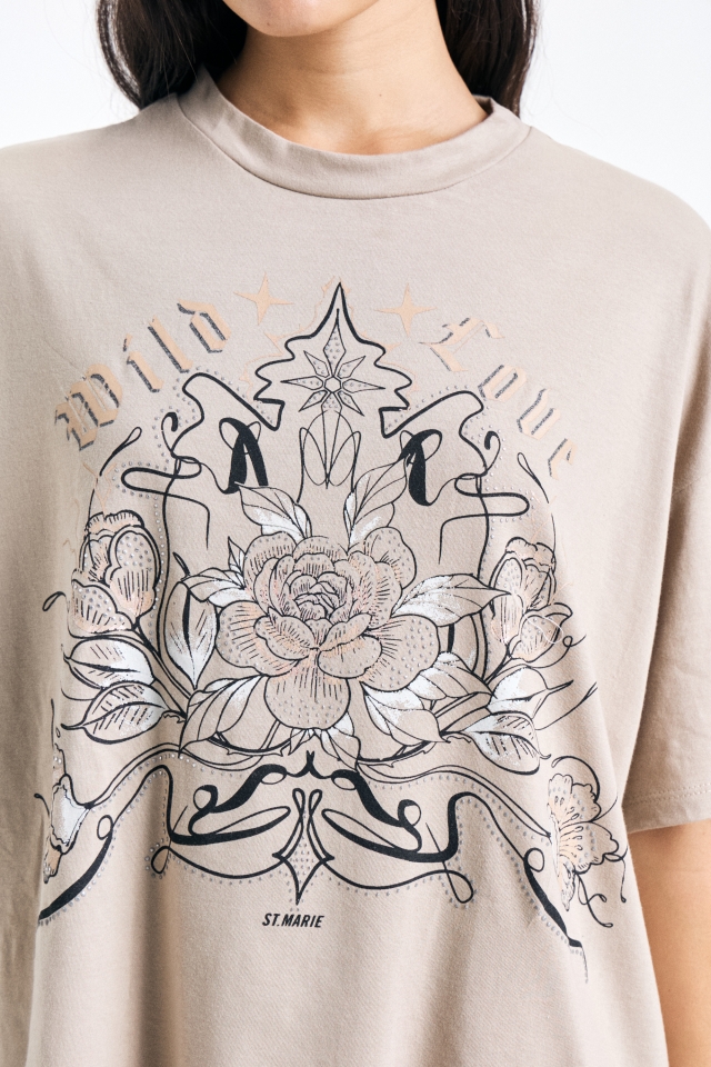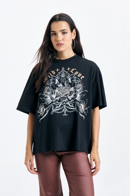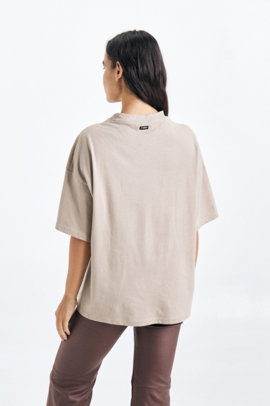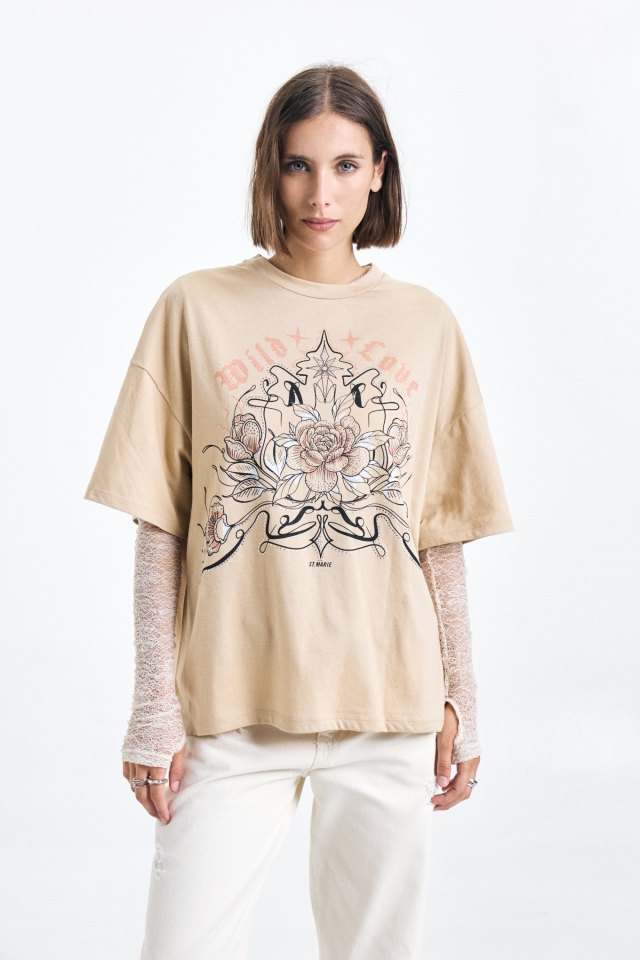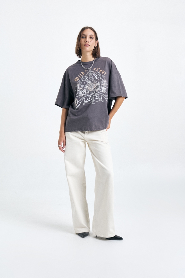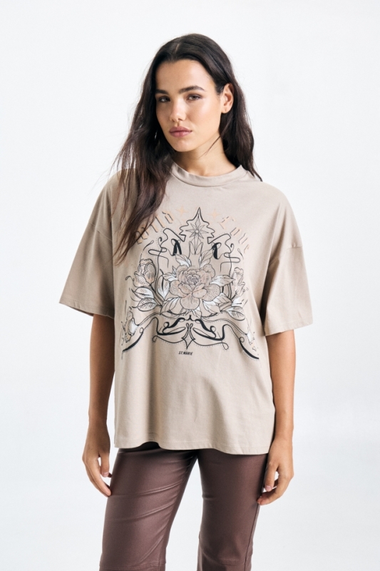 Remera de jersey oversize estampada, con cuello redondo clasico, lleva doble etiqueta.Composición: 100% Algodón