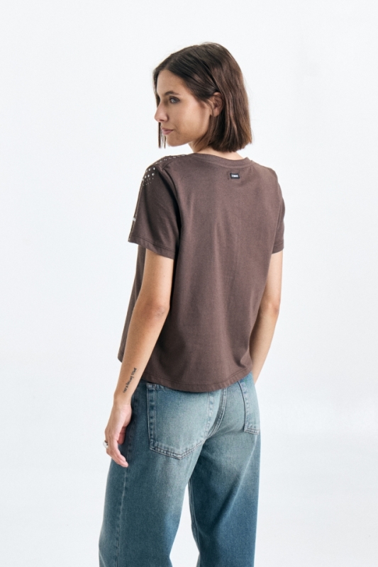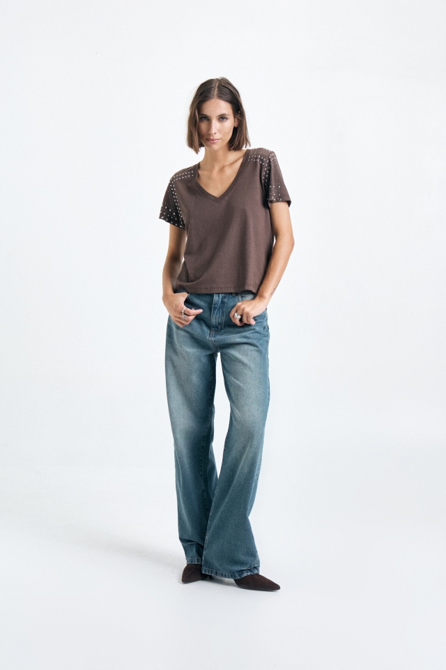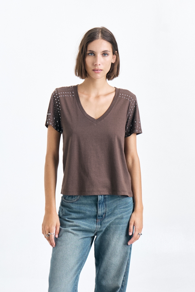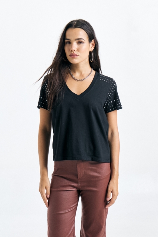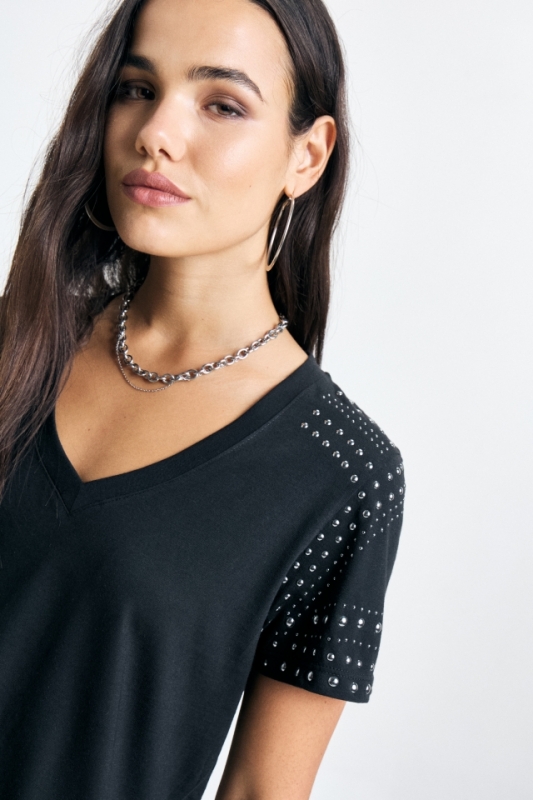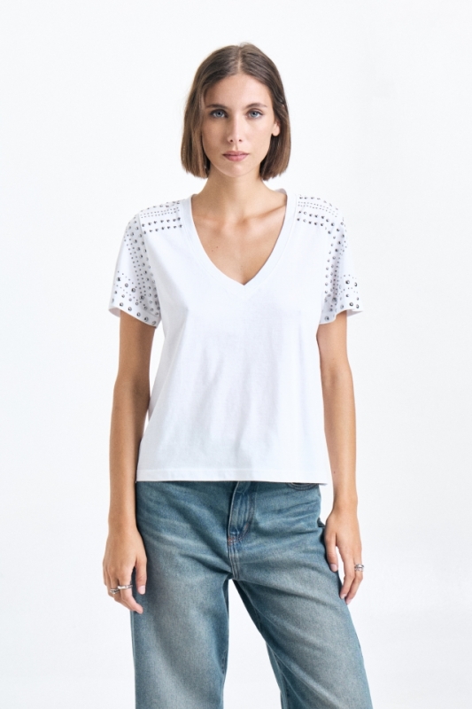 Remera de Jersey escote V profundo, de corte clásico, con dibujo abstracto de tachas en delantero.Composición: 100% Algodón