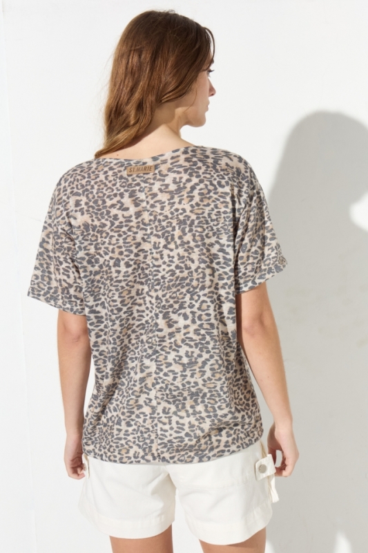 Remera de lino estampado full print con escote clásico redondo, manga corta.En su espalda posee detalle de badana grabada.Composición: 63% Poliester 37% Rayon