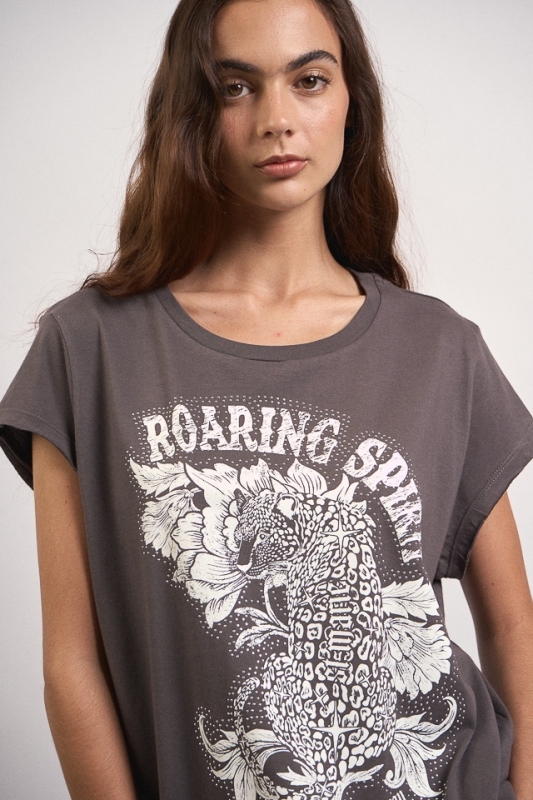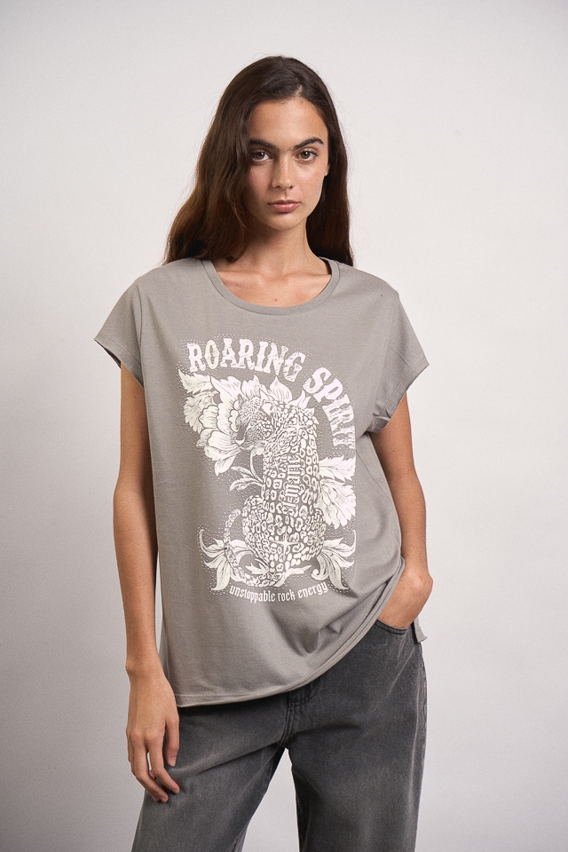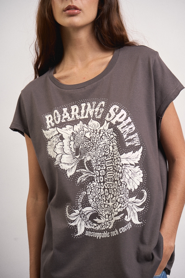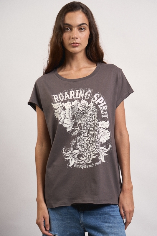 Remera estampa escote redondo, manga con terminación al corte y cuello combinado con complemento. La estampa lleva detalle de hotfix y en la espalda trasera posee una grifa con identificación de marca. 100% Algodón