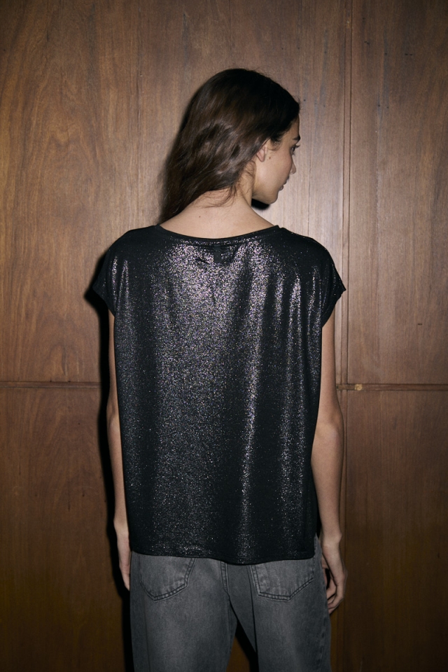 Remeron ancho de foil, su escote es redondo clásico, y su ruedo es redondeado. A modo de detalle en el centro de la espalda se le colocó un colgante con la identificación de la marca.