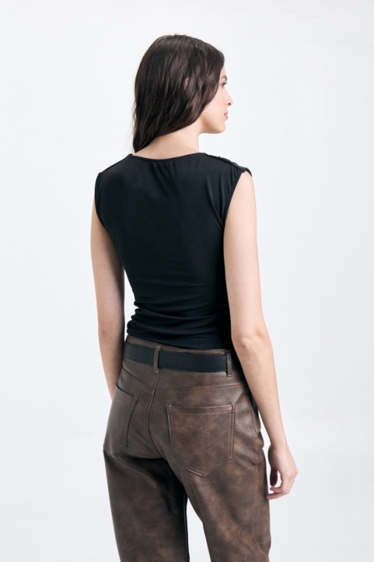 Remera sin mangas, confeccionada en microfibra lisa. Lleva escote embolsado y hombros ligeramente fruncidos. En la espalda lleva detalle de dije cosido a mano con el logo de la marca. Comnposición: 93% poliéster 7% spandex