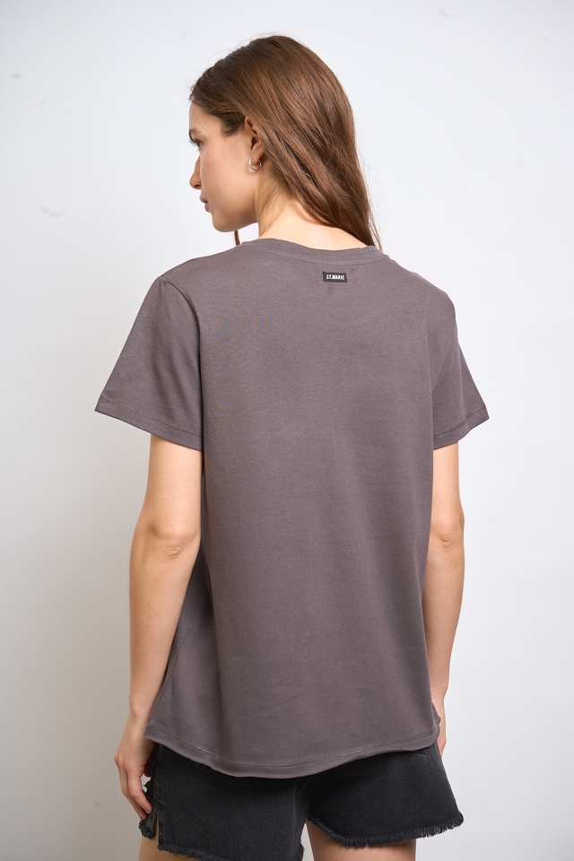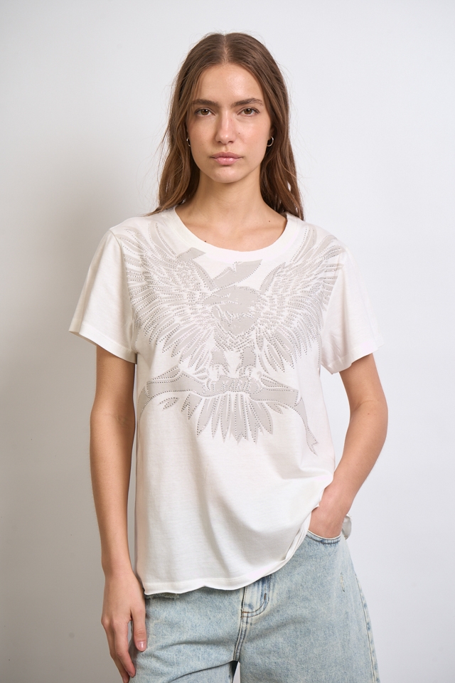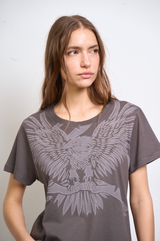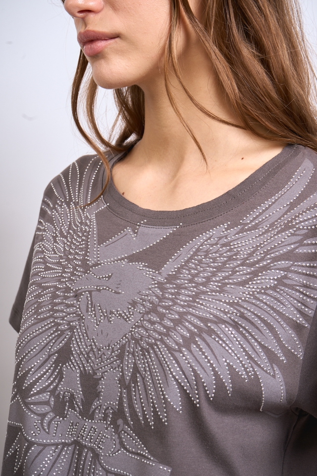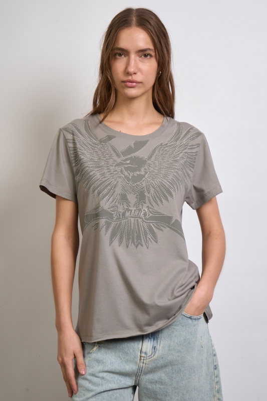 Remera escote redondo estampada, con detalle de hotfix. Lleva complemento en escote y en el centro de la espalda una grifa con identificación de marca.100% Algodón.