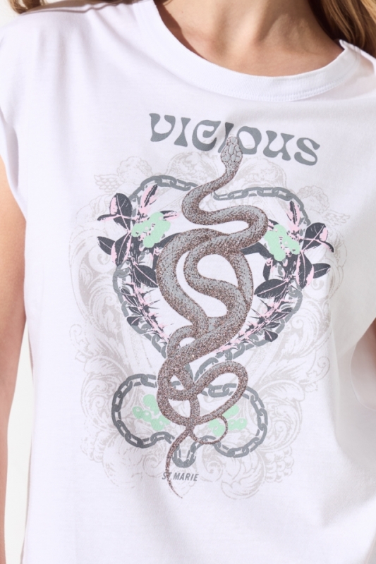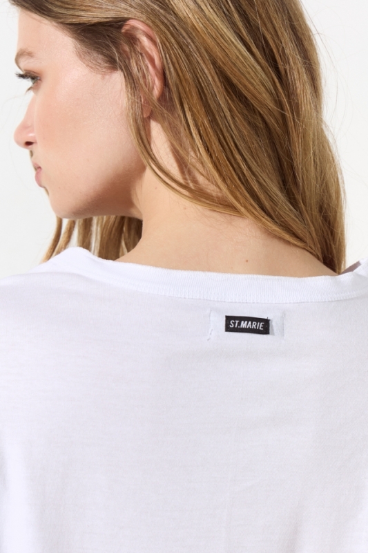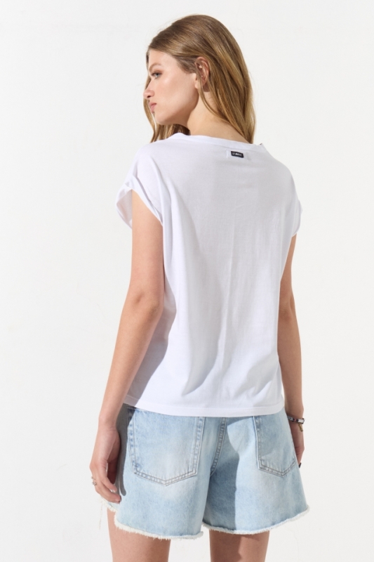Remera estampada, de escote redondo clásico, en las mangas tiene un pequeño frunce y en el centro de la espalda lleva una grifa con identificación de marca.