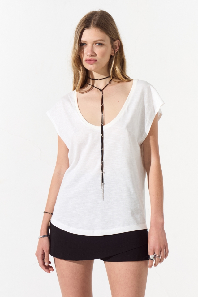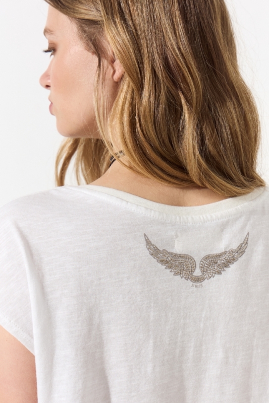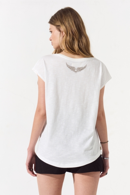 Remera de flame, posee un escote en v terminado en complemento del mismo tono que la tela base, en el centro de su espalda lleva un hotfix de alas con la identificación de marca.