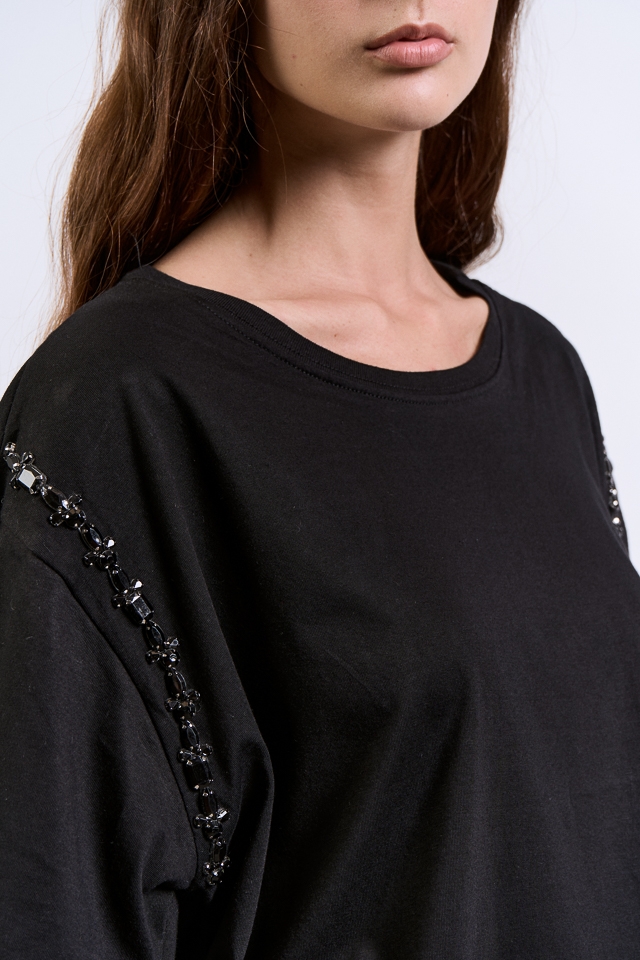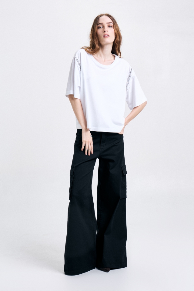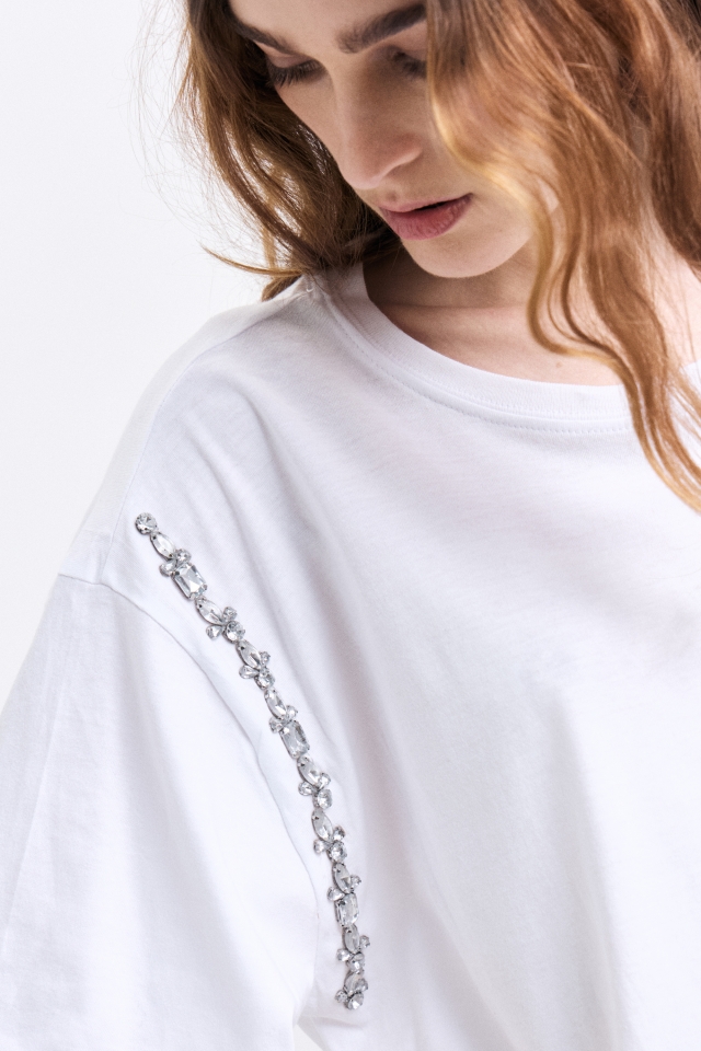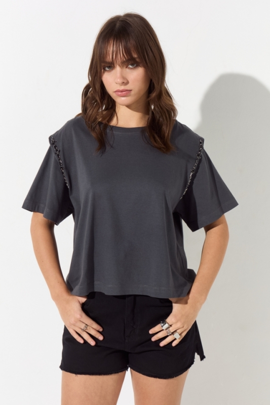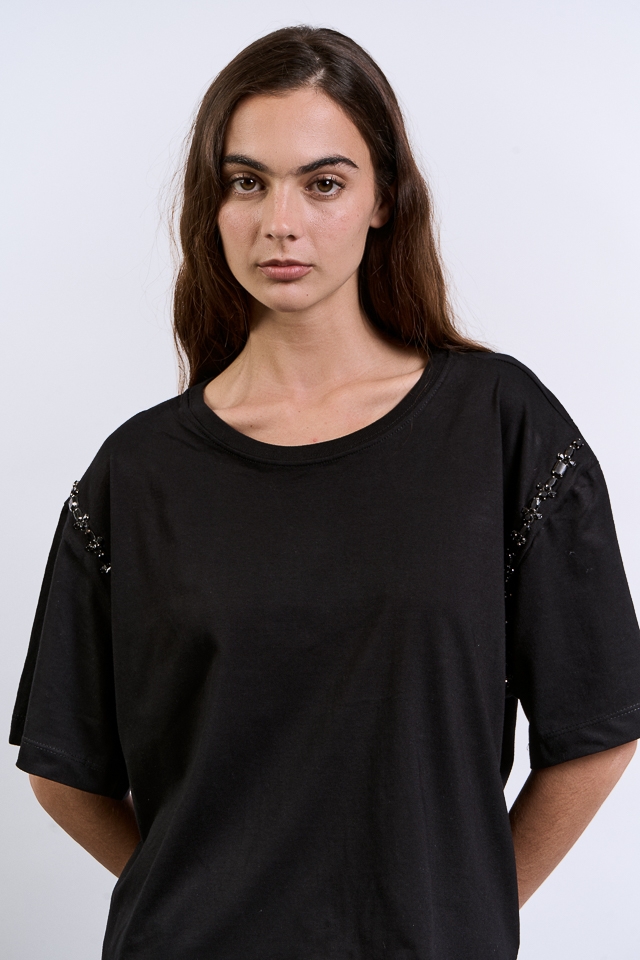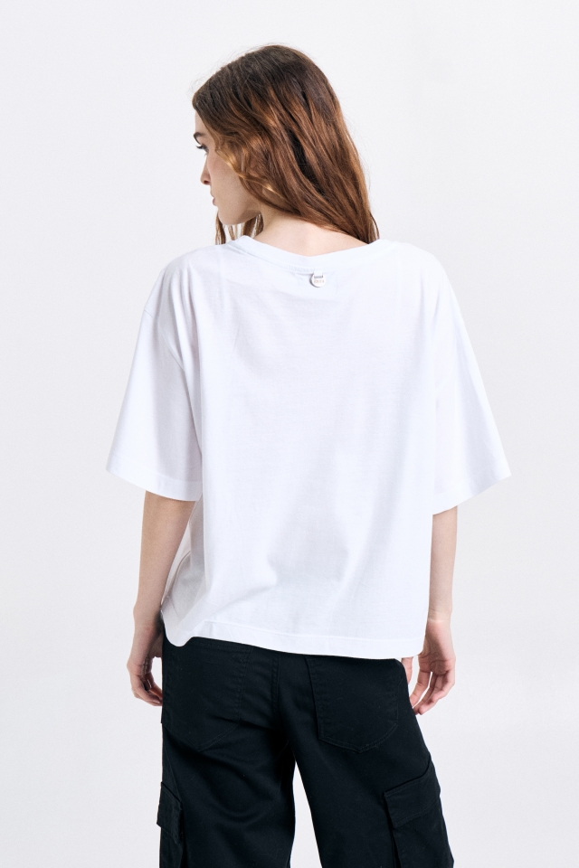 Remera manga corta de jersey, posee escote redondo y detalle de hotfix en las sisas. A modo de detalle en el centro espalda cuenta con una chapita de identificación de marca. Composición: 100% Algodón
