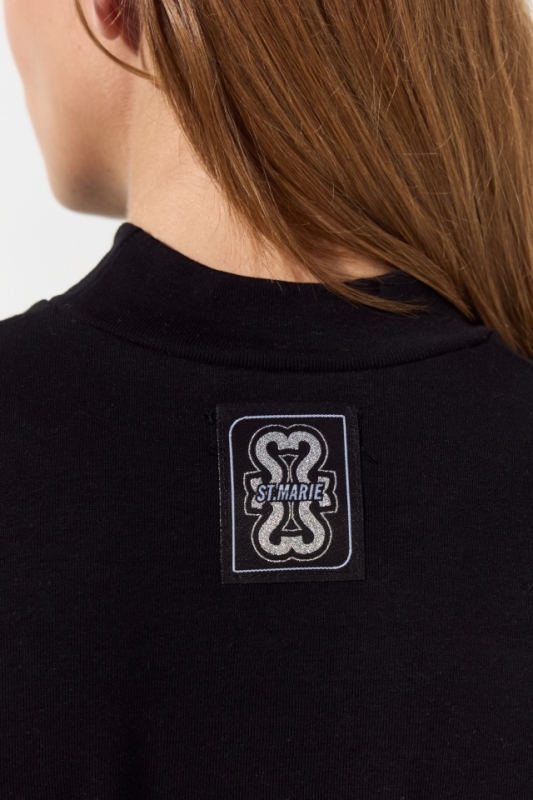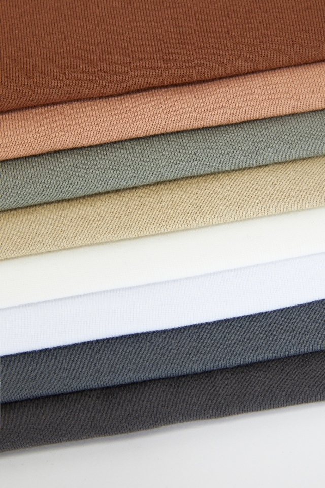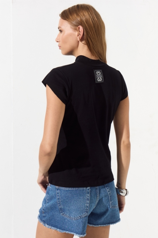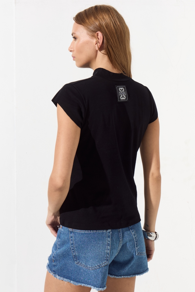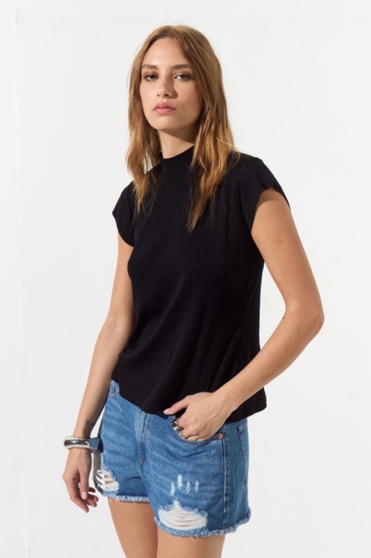 Remera básica con cuello media polera y manga corta al corte, confeccionada en reeb súper soft. Detalle de etiqueta bordada en el centro superior de la espalda. Composición: 100% Algodón