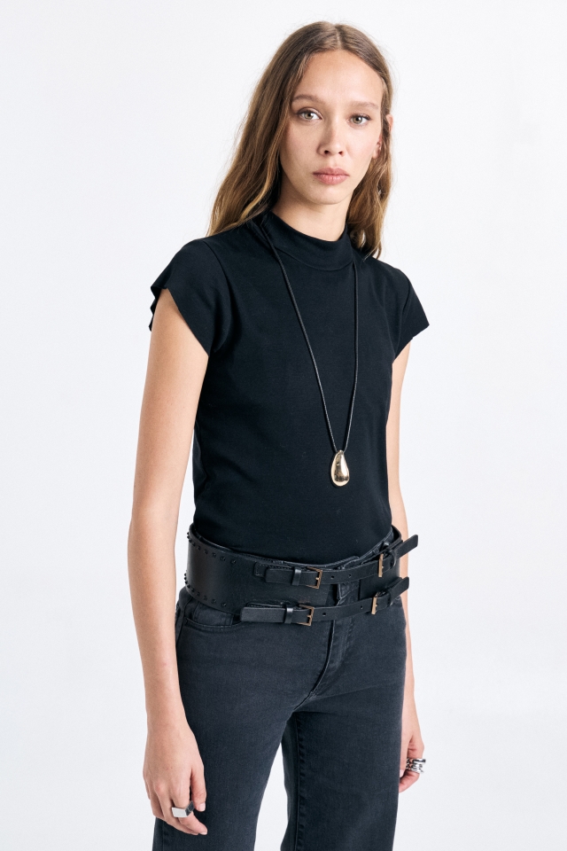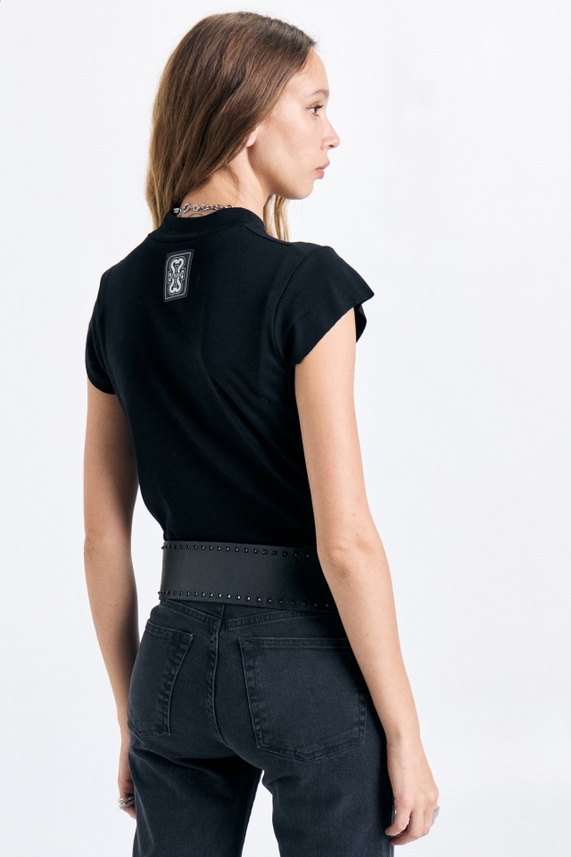Remera básica con cuello media polera y manga corta al corte, confeccionada en ribb. Detalle de etiqueta bordada en el centro superior de la espalda. Composición: 100% Algodón
