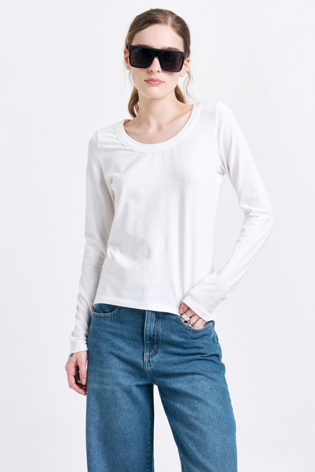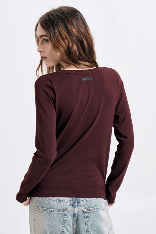 Remera manga larga, de corte ajustado, con bies de cuello pespunteado. Confeccionada en algodón con lycra, lleva detalle de badana de cuero en la espalda. Composición: 98% Algodón 2% spandex