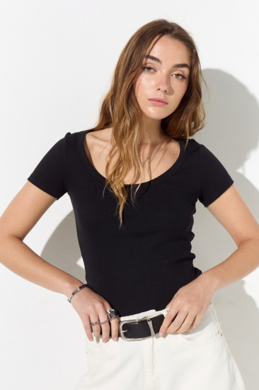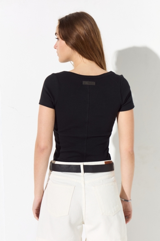 Remera de morley básica con escote redondo profundo y mangas cortas.Además tiene badana de pu con identificación de marca grabada.