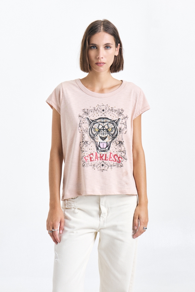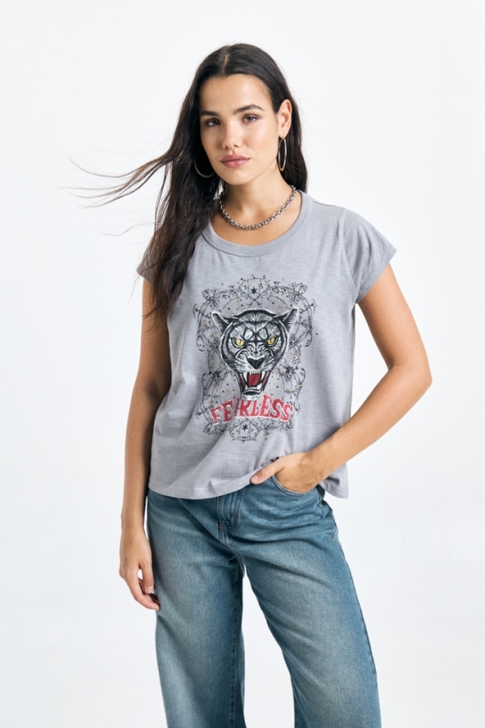 Remera en jersey flamé con estampa delantera exclusiva y detalle de strass. Composición: 100% Algodón