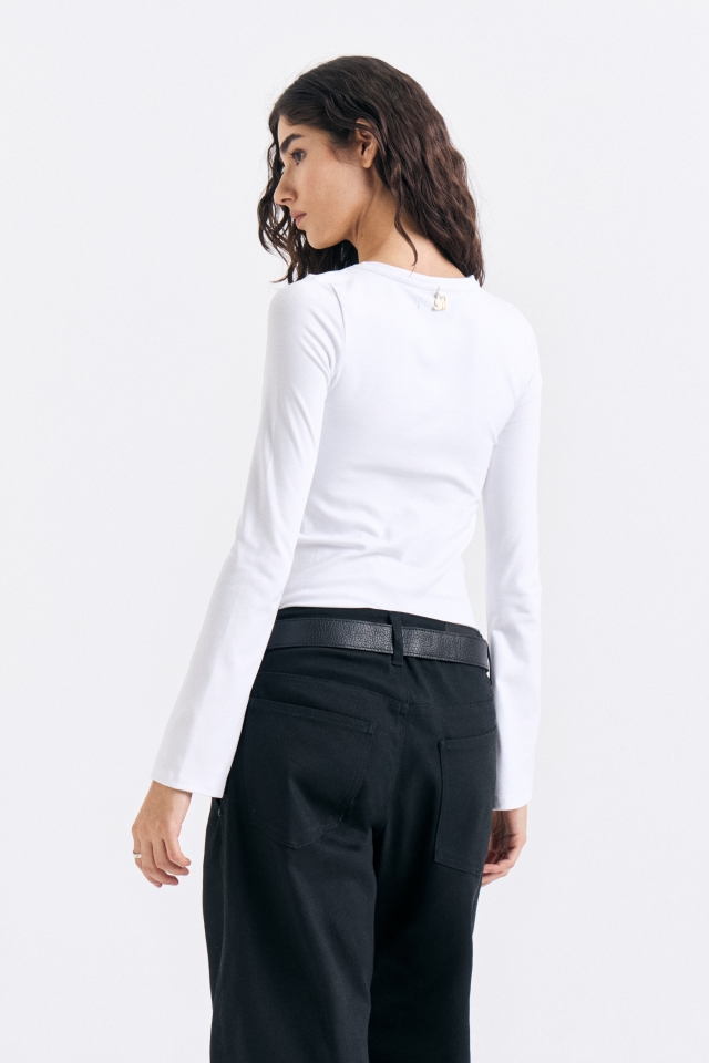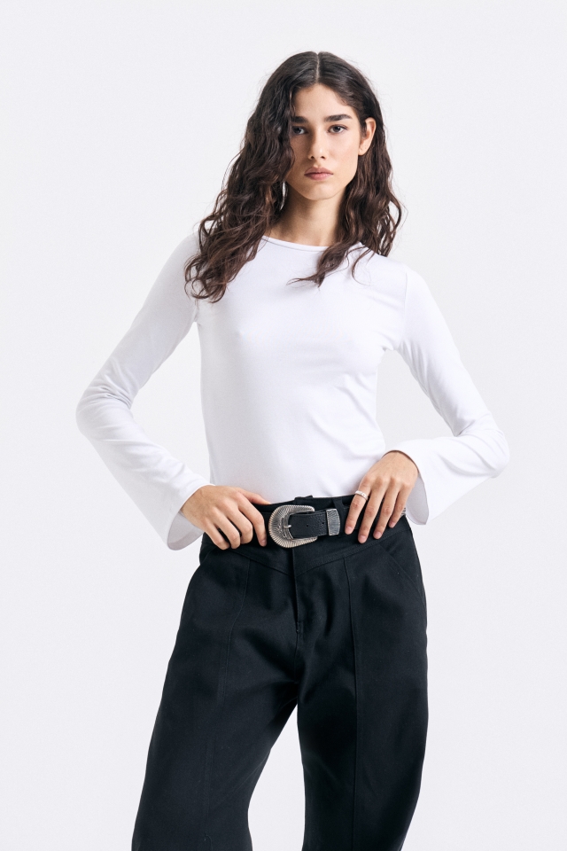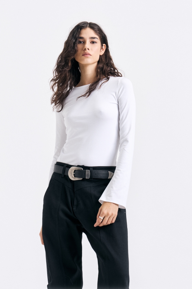 Remera de Rib Soft con calce clásico. Cuello redondo clásico a la base y manga acampanada.Composición: 80% Poliéster 20% Spandex