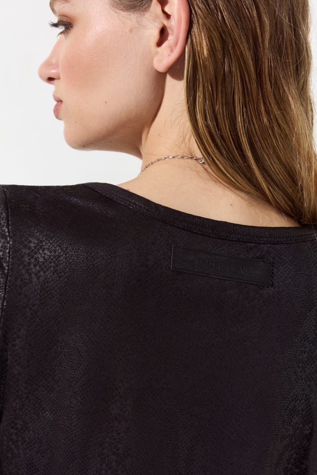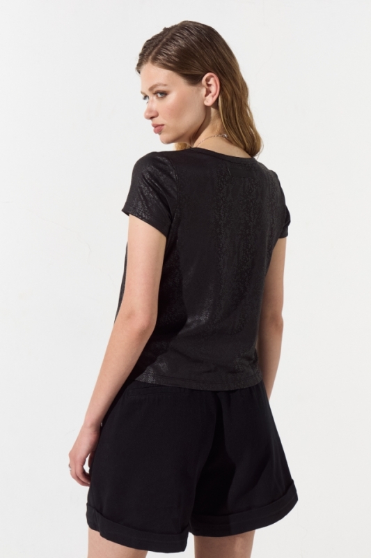 Remera de estampado reptil. Calce entallado y escote en U. Con etiqueta de marca.Composición: 96% Algodón 2% Lycra