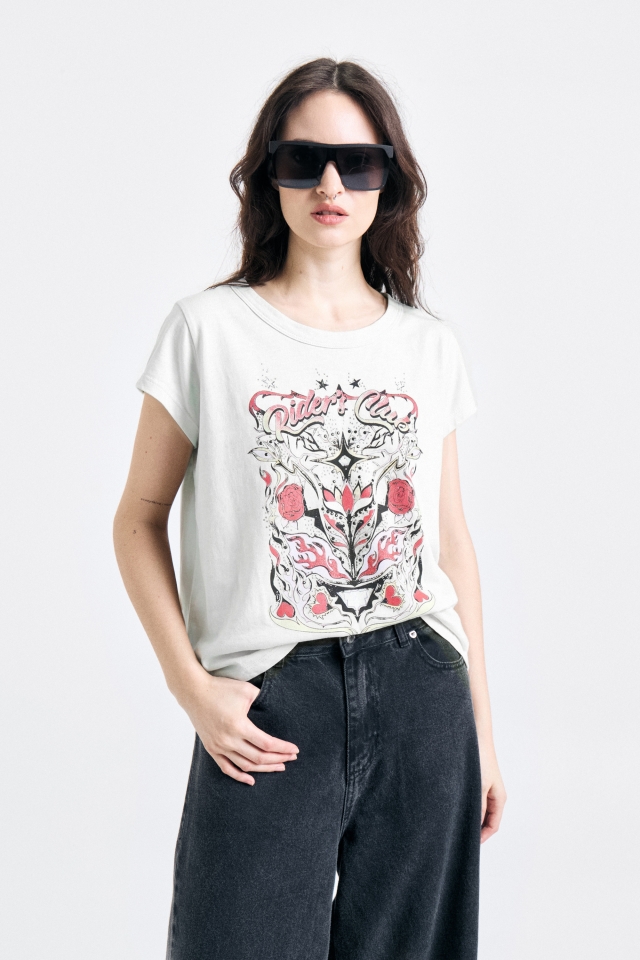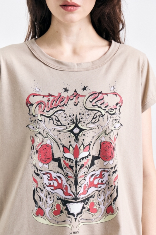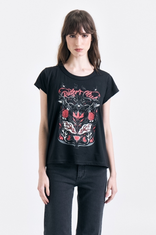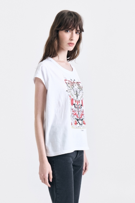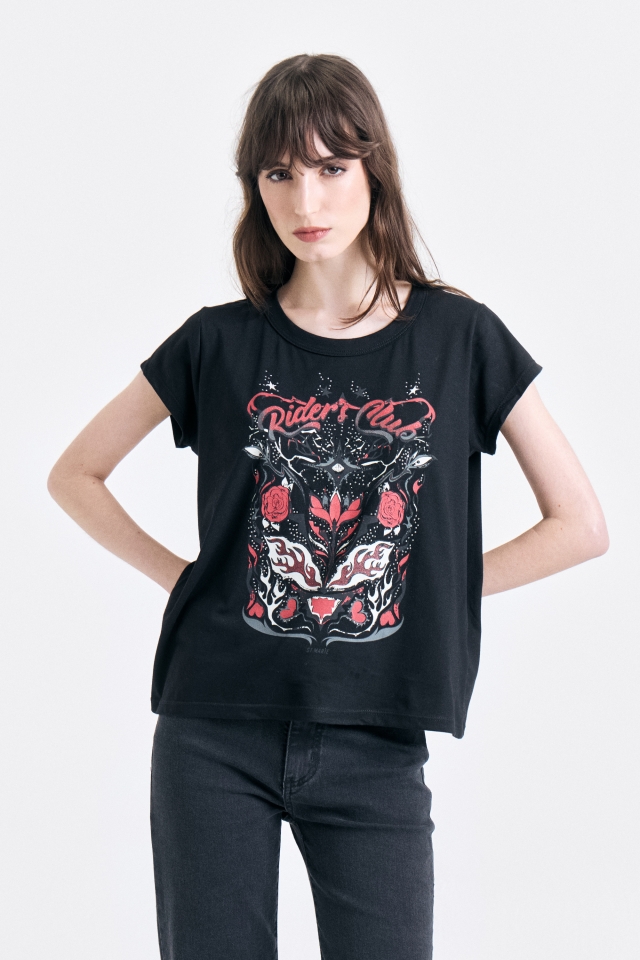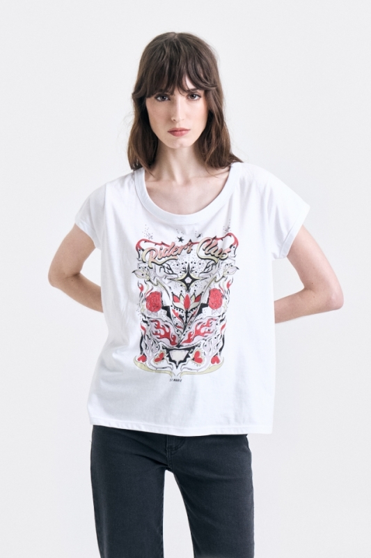Remera de jersey estampada con cuello redondo, calce clásico.Detalle de strass en estampa.Composición: 100% Algodón