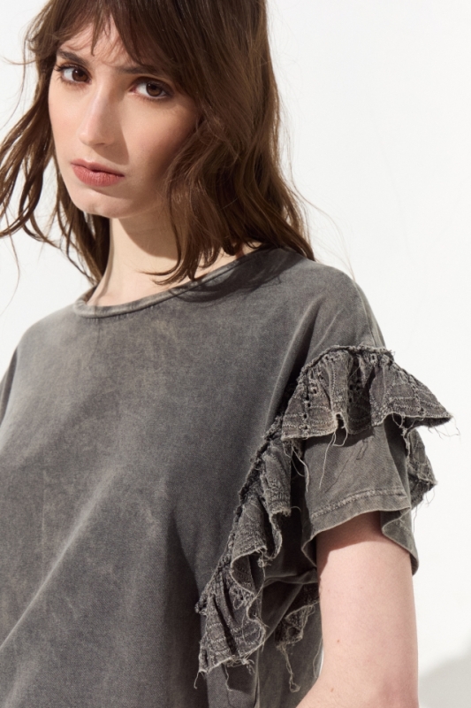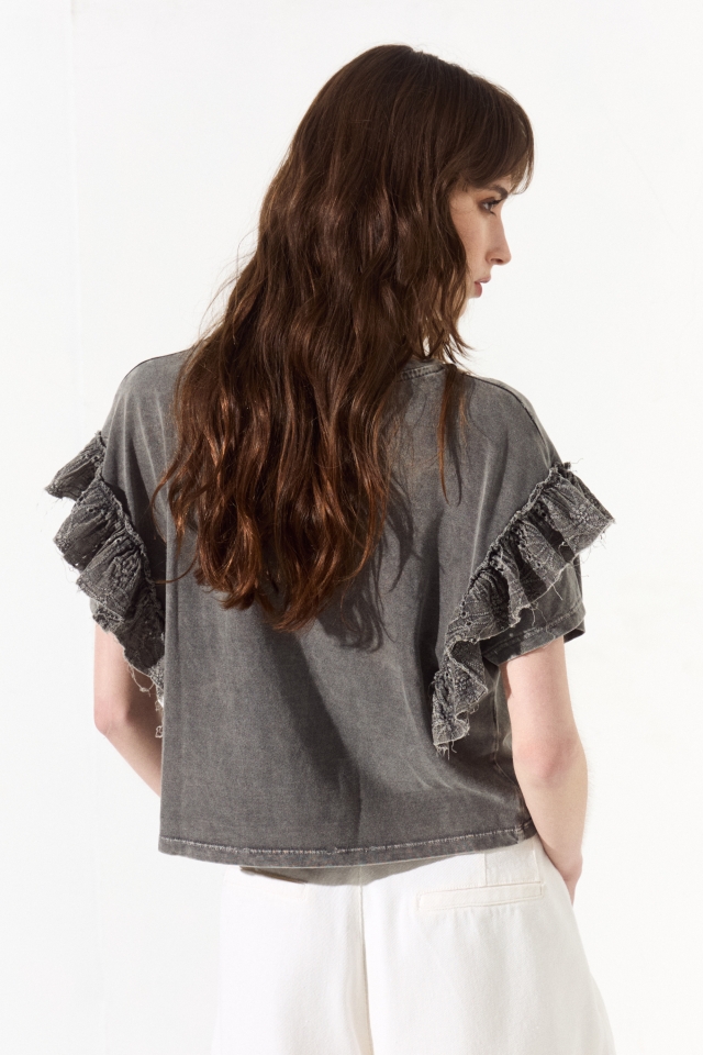 Remera de jersey con manga de broderie, escote redondo clásico. Composición: 100% Algodón