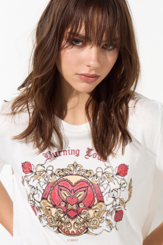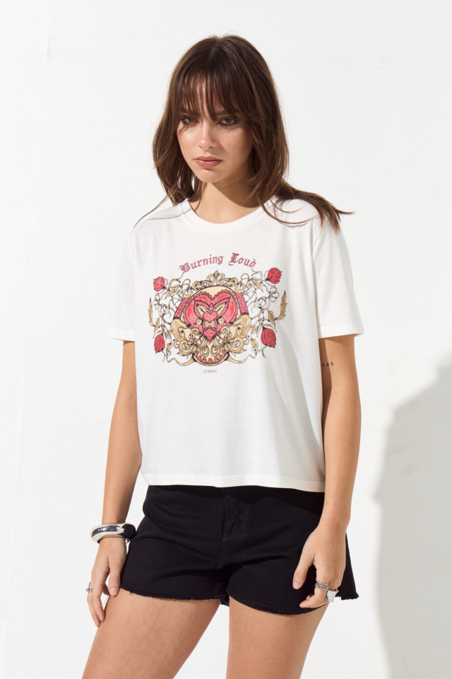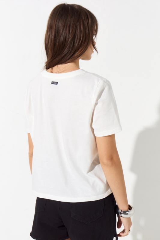 Remera estampada de algodón, su calce es clásico, posee escote redondo y es larga hasta la cintura. En el centro de su espalda lleva una grifa con la identificación de marca.