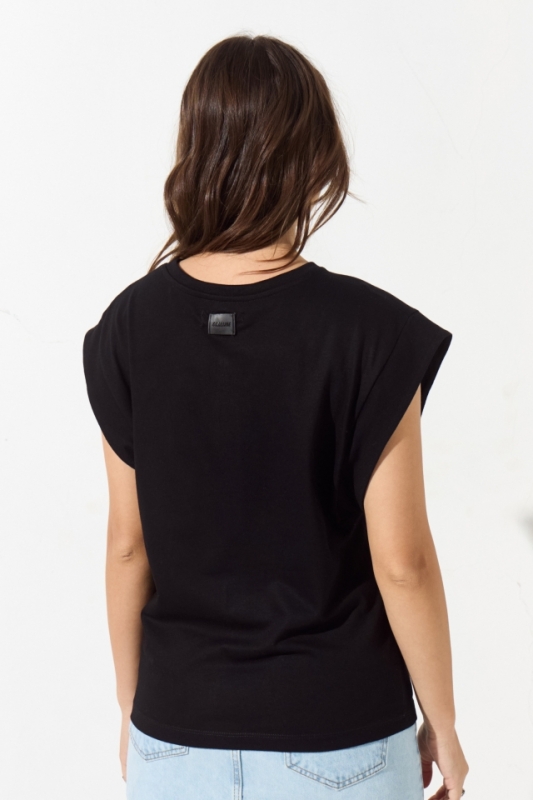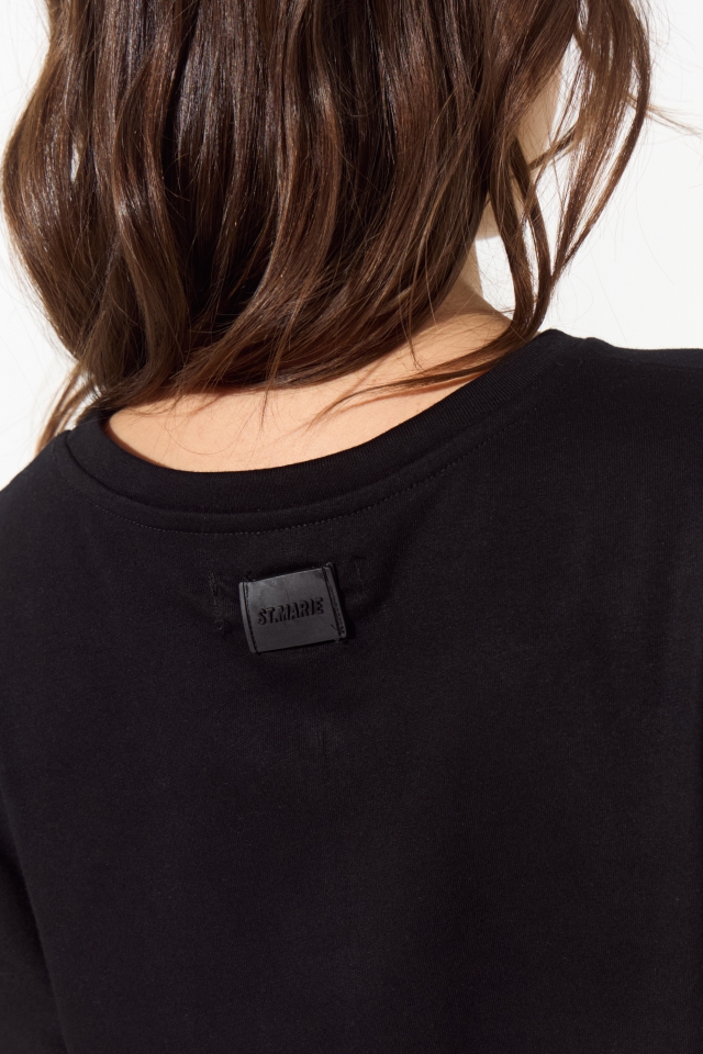 Remera de jersey con zócalo en las mangas, la misma tiene un corte amplio, su escote es redondo y está terminado con ribb para darle más estabilidad a la prenda y mejor terminación. En el centro de su espalda lleva una badana de cuero con la identificación de marca.