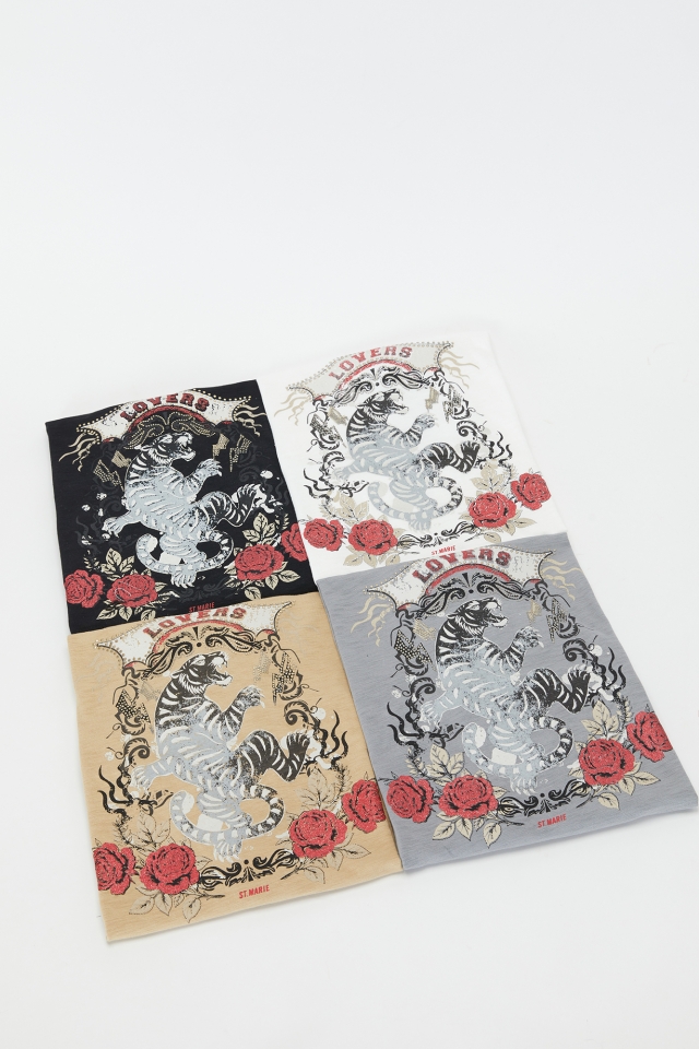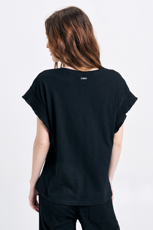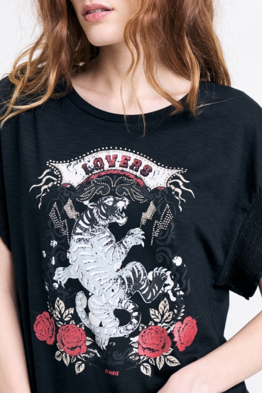 Remera en jersey flamé con estampa "Lovers". Terminación de mangas volante con tiras tejidas en lúrexComposición: 100% Algodón