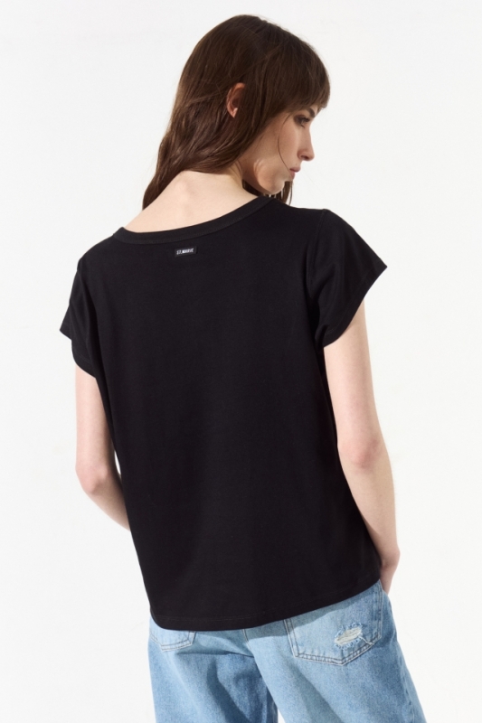 Remera estampada de corte clásico, lleva un escote redondo y zócalo en sus mangas. En el centro de la espalda lleva una grifa con la identificación de la marca.
