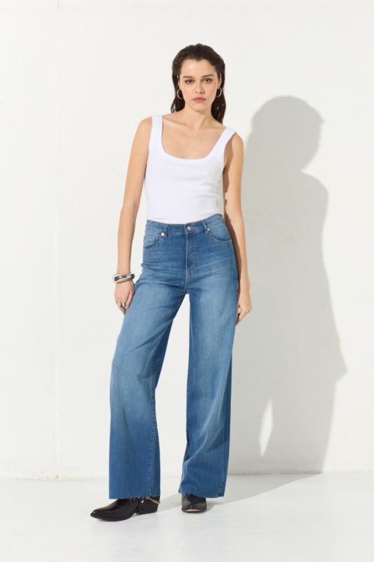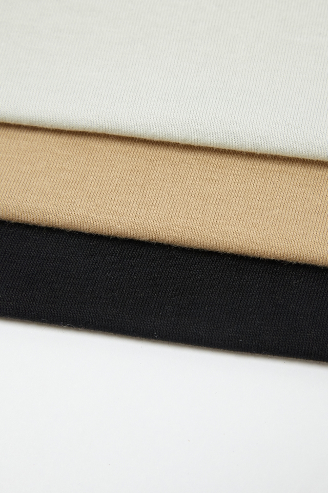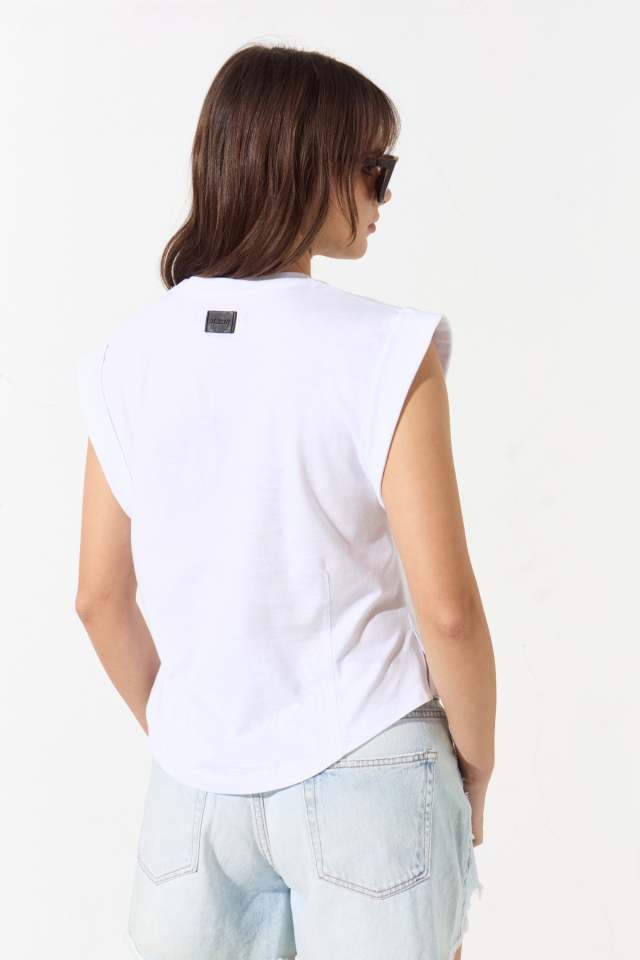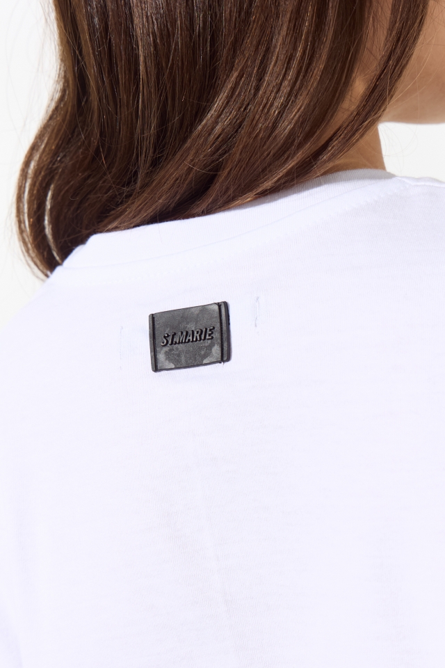 Remera de jersey, su calce es clásico, en el centro delantero tiene dos costuras con doble pespunte que generan entalle, sus mangas llevan zócalo y el escote está complementado con una pequeña guía de la misma tela. En el centro de la espalda se le colocó una badana de cuero con la identificación de marca.