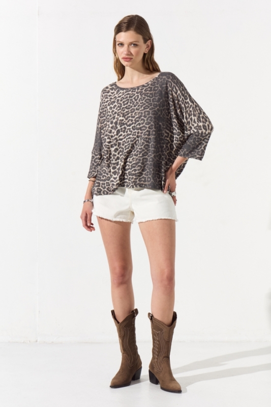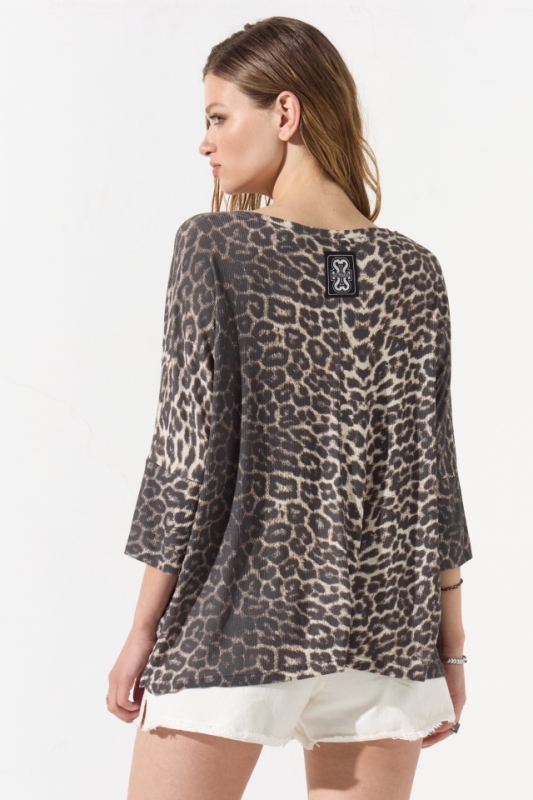 Remerón de morley con escote redondo amplio y mangas 3/4.Tiene estampado animal print exclusivo y etiqueta bordada con identificación de marca.