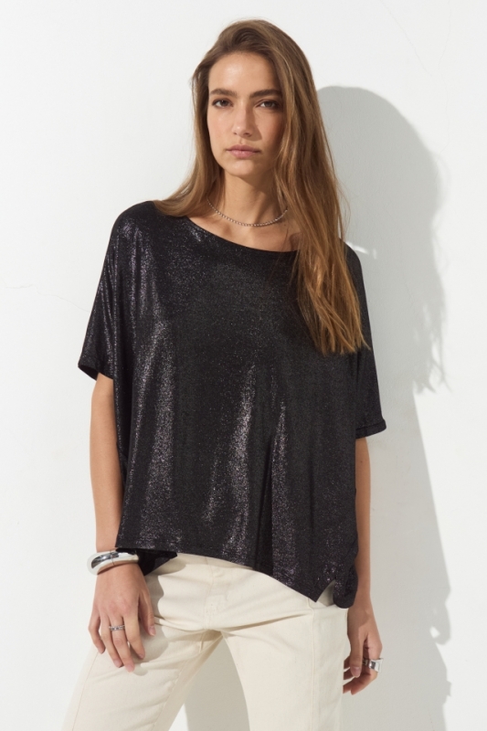 Remeron de viscosa, su tela es de foil brillosa. Su delantero es mas corto que su espalda y en su centro tiene un tajo. Sus laterales también cuentan con pequeños tajos, que terminan de darle terminación a la prenda. Además a modo de detalle posee un colgante con la inscripción de la marca que acompaña a tono.