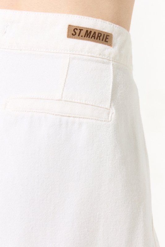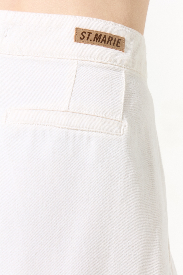 Short de jean tiro alto, con pinzas delanteras, bolsillos en el delantero y ojal en trasero. El ruedo está dobladillado hacia arriba y en la cintura espalda lleva una badana de cuero con la identificación de marca.
