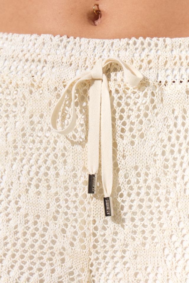 Short playero de crochet con forrería interna. LLeva cordón plano en cintura con terminales de zamak grabadas con el nombre de la marca. En la parte trasera, por debajo de la cintura, lleva herraje de marca.