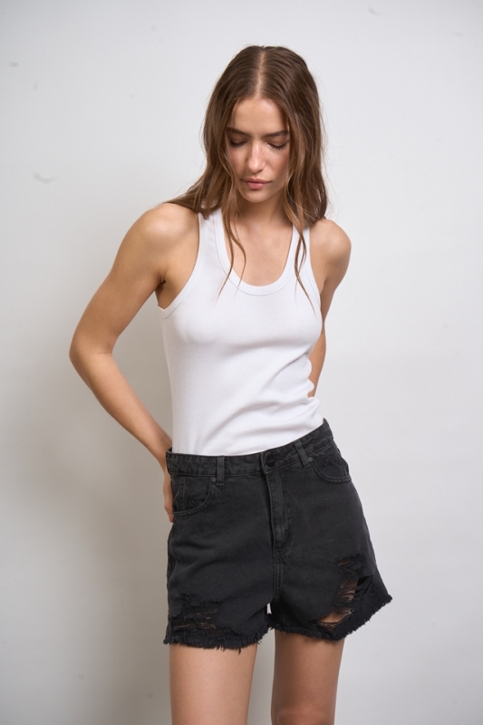 Short calce relajado de cinco bolsillos, su ruedo esta desflecado y posee tajos laterales.Composición: 100% Algodón