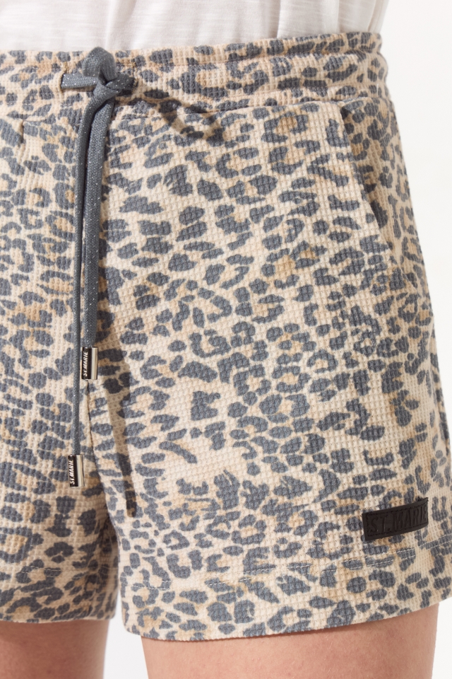 Short confeccionado en waffle, de calce relajado, con elástico en cintura y cordón de ajuste con terminales metálicas. Tiene en delantero zona ruedo, identificación de marca en pu grabado.