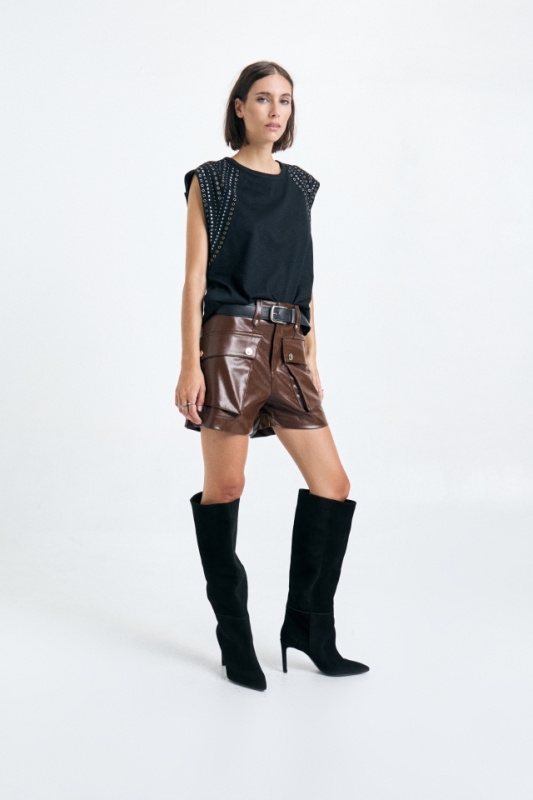 Short de cuero quebrado con bolsillos delantero cargo. Sus bolsillos están terminados con atraques identitorios de marca. Posee presillas en delantero y espalda, además de un bolsillo ojal en el trasero. Composición: 100% PU
