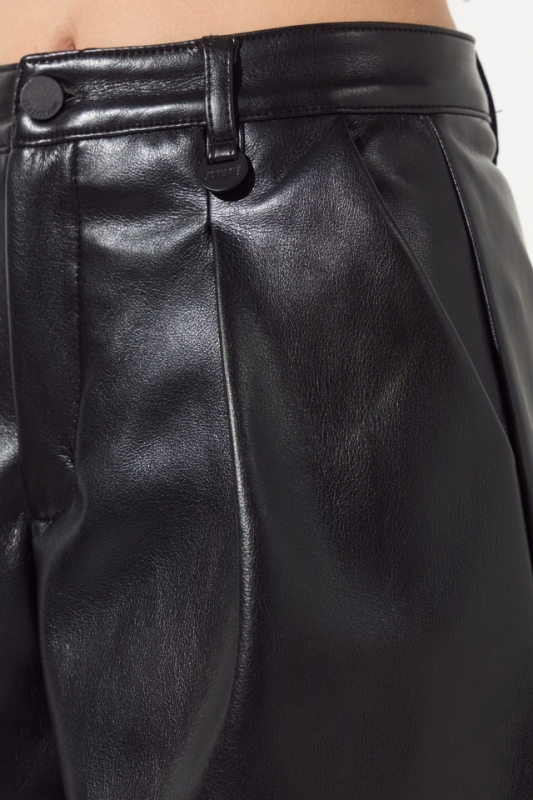 Short de pu, la prenda tiene un corte sastrero, lleva dos pinzas de entalle en el delantero y en el trasero, además cuenta con presillas que le permiten el pasador de un cinturón. En su frente posee dos bolsillos laterales, y el ruedo está terminado con un dobladillo hacia afuera. A modo de detalle tiene un colgante con la identificación de la marca.
