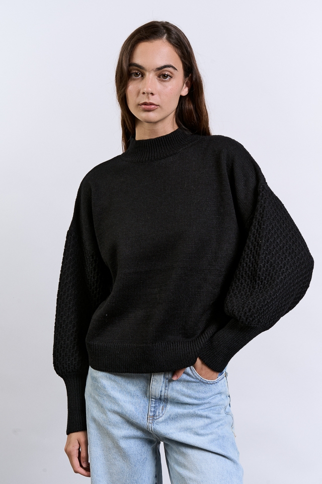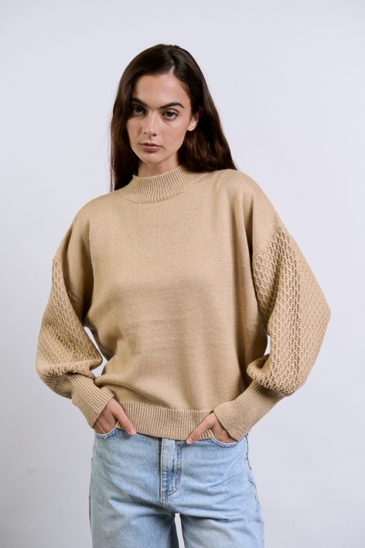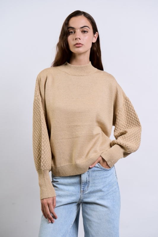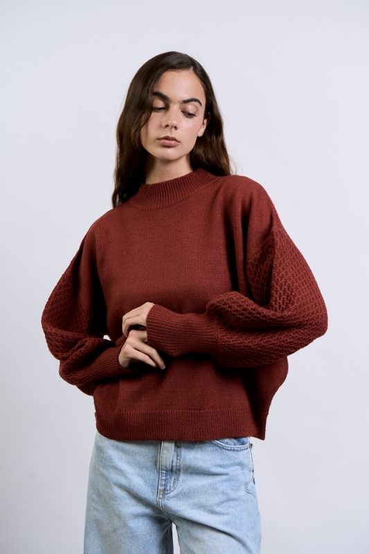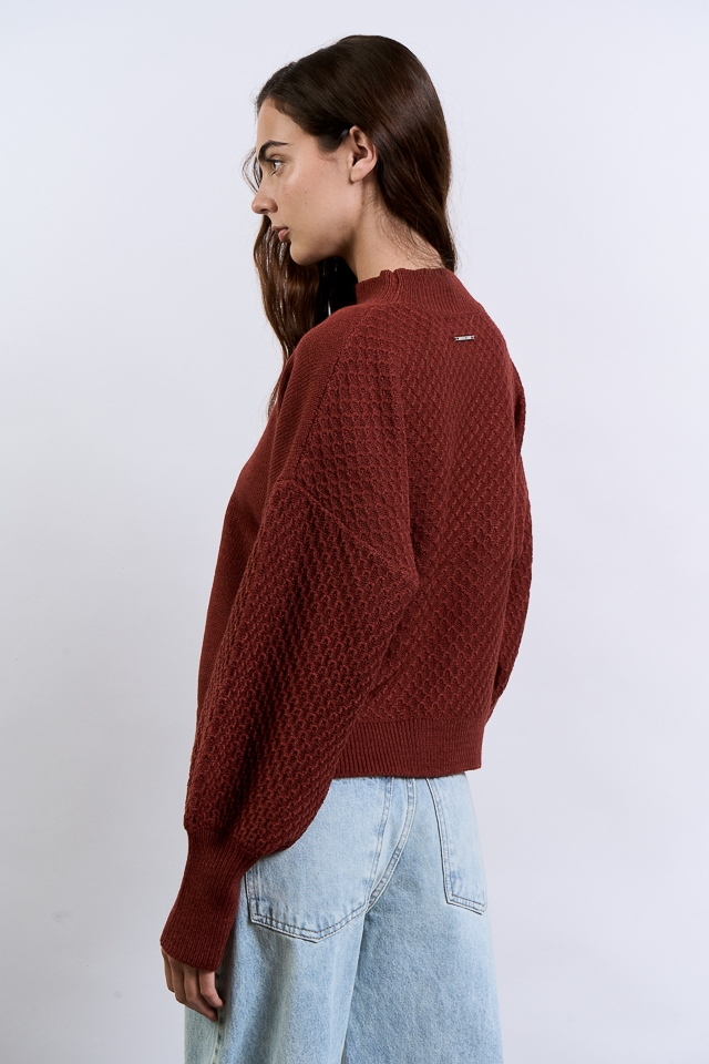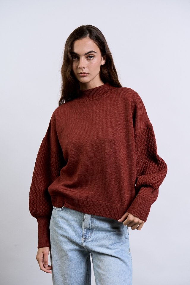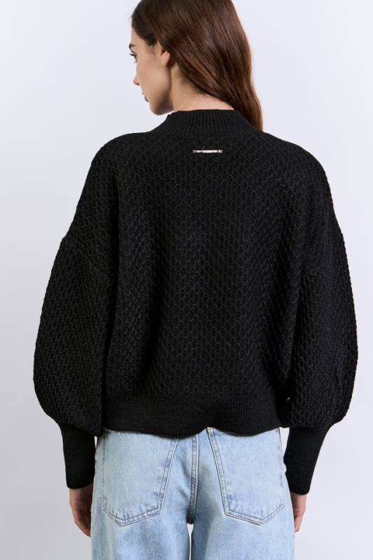 Sweater tejido con una combinación de puntos. Presenta media polera y mangas con volumen estilo semi balloon. Incluye chapita metálica con identificación de marca grabada en el centro espalda.
