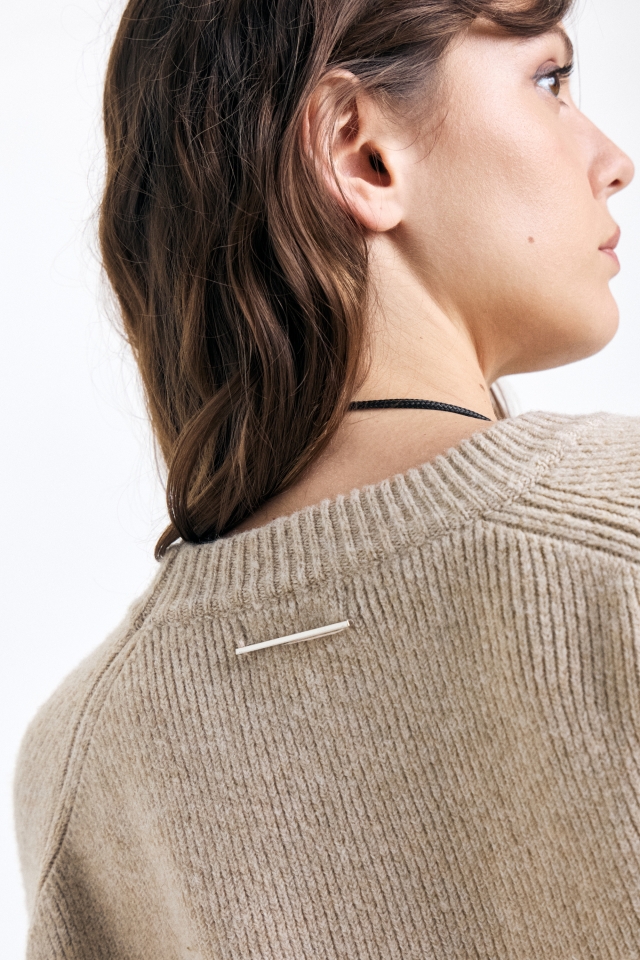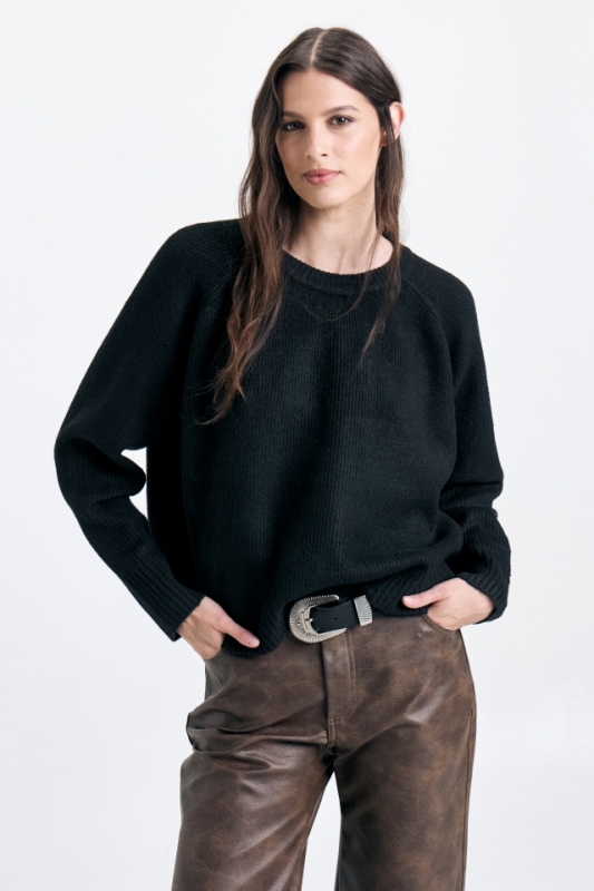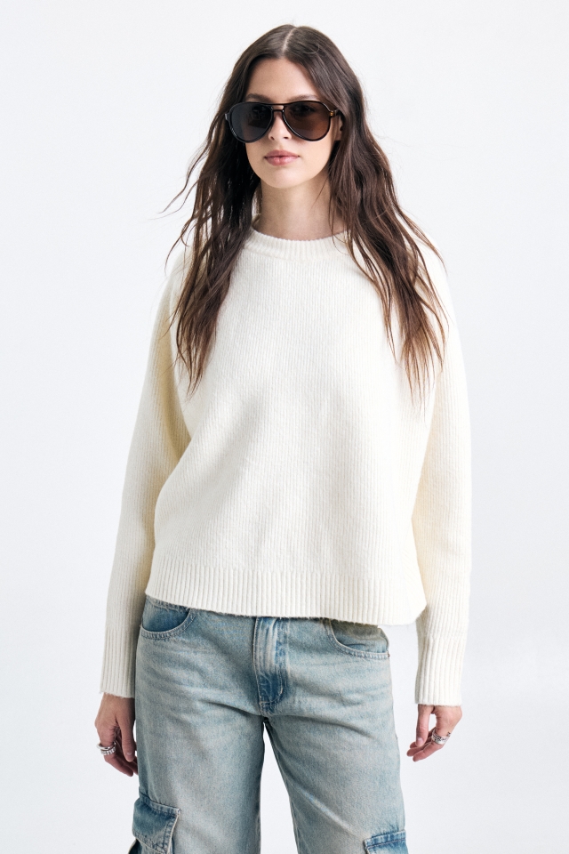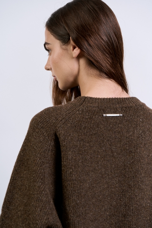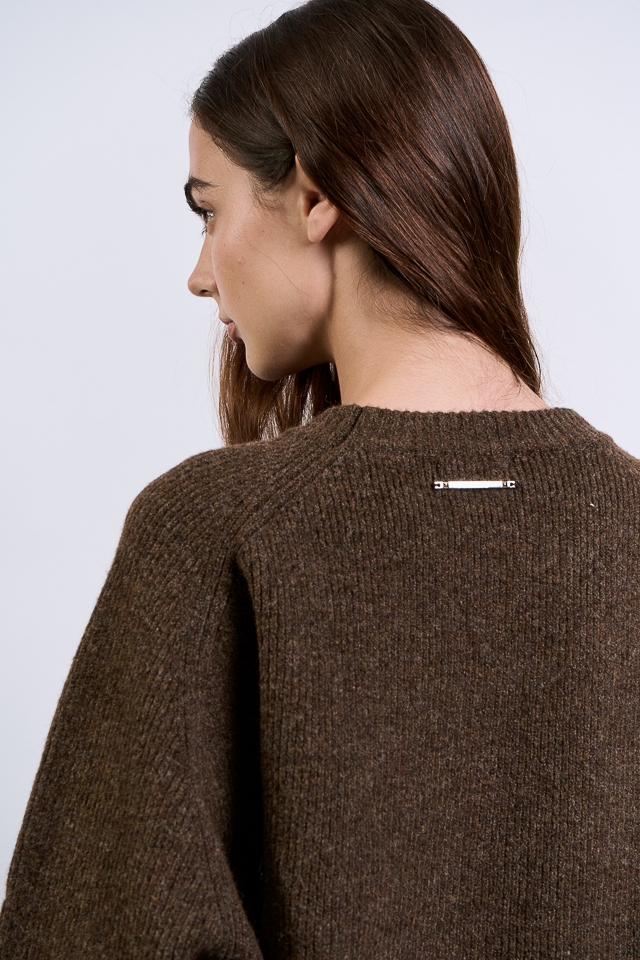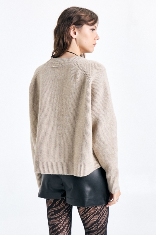 Sweater de calce holgado y escote a la base. Tiene manga ranglan y chapita metálica