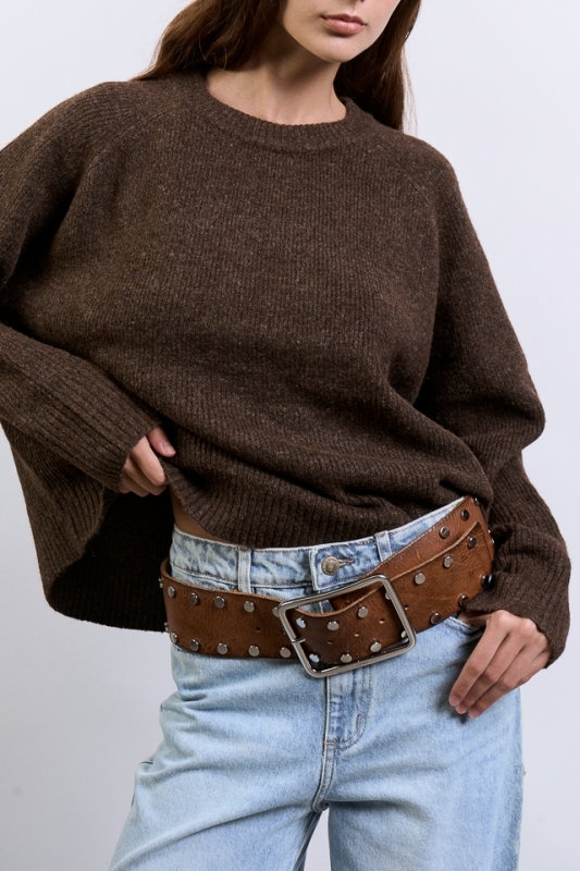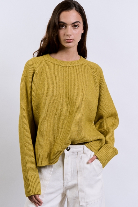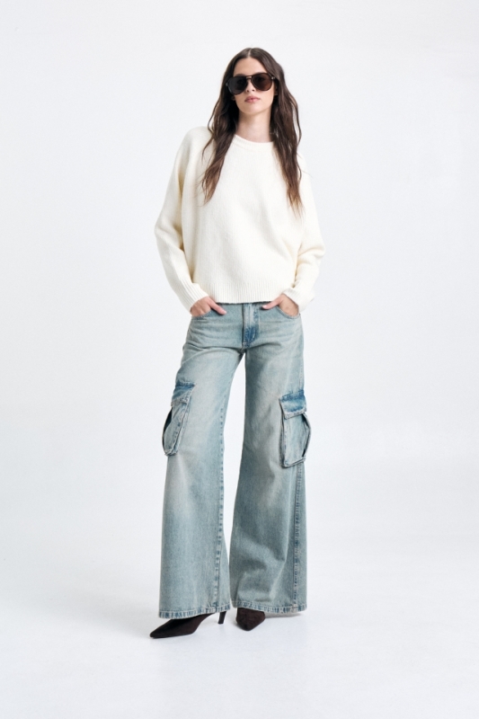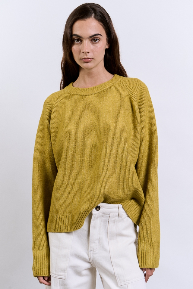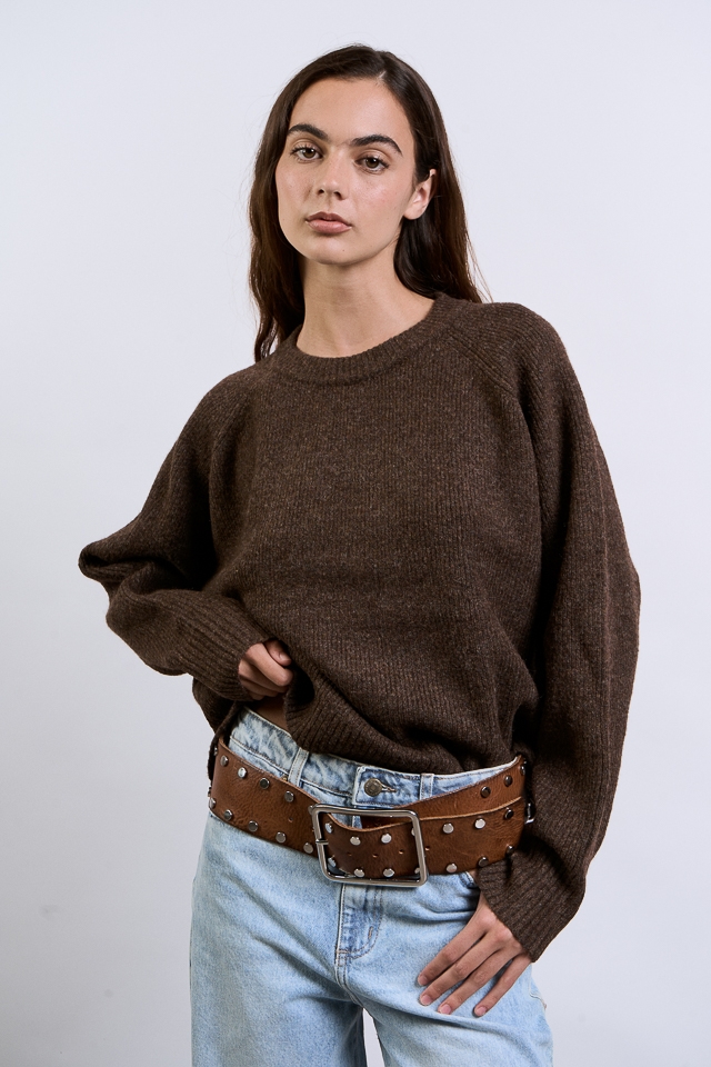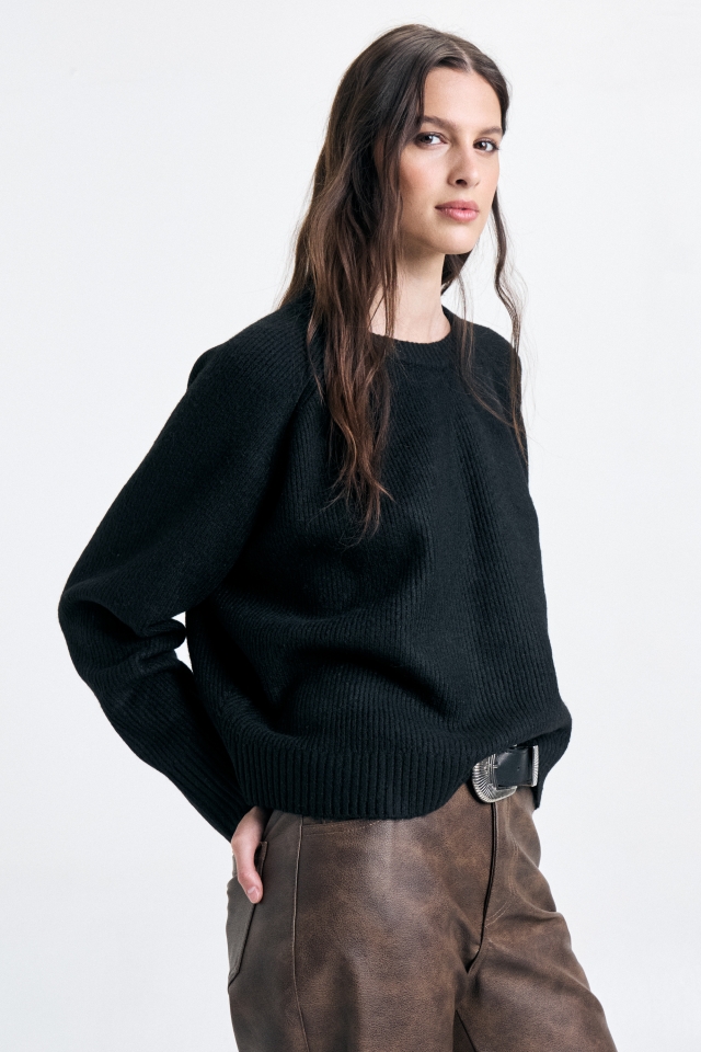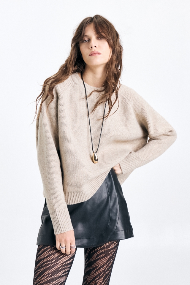 Sweater de calce holgado y escote a la base. Tiene manga ranglan y chapita metálica
