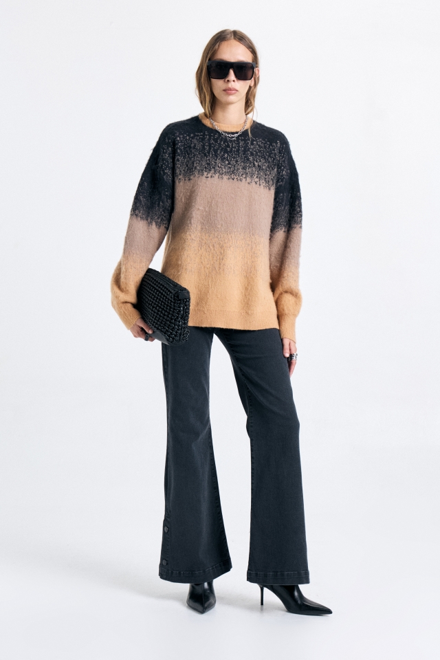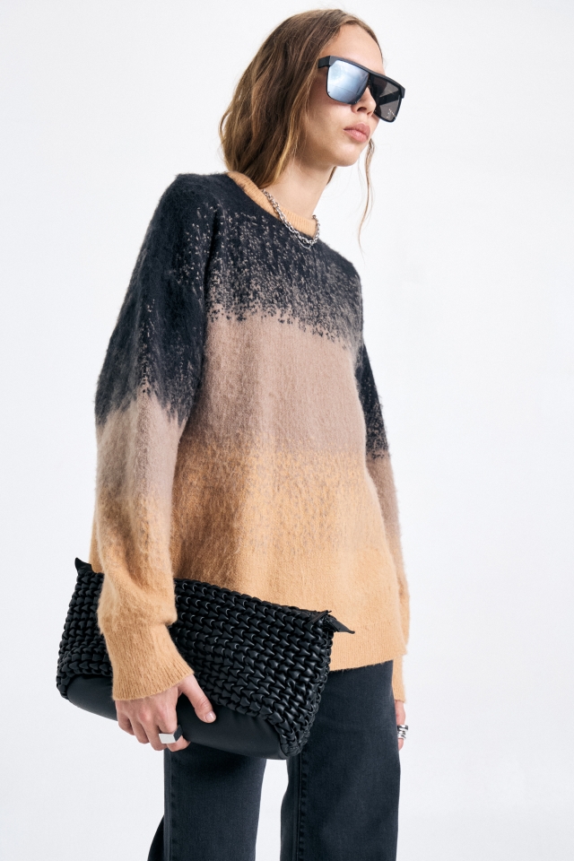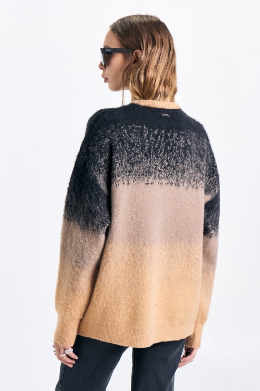 Sweater de calce holgado con escote redondo. Tiene diseño en degradé y grifa metálica con identificación de marca grabada. Composición: 41% acrílico 30% poliester 29% poliamida HECHO EN CHINA
