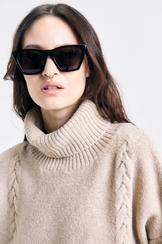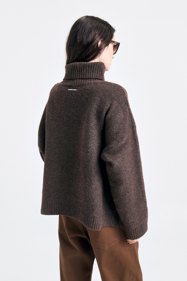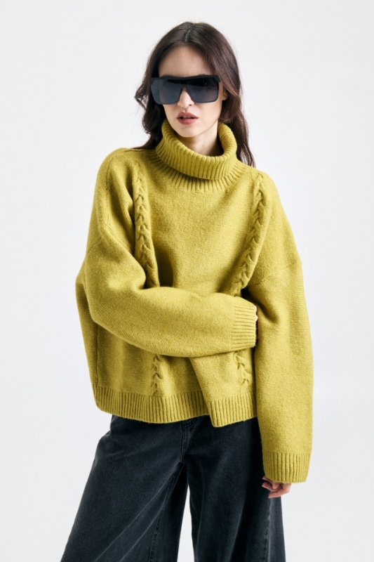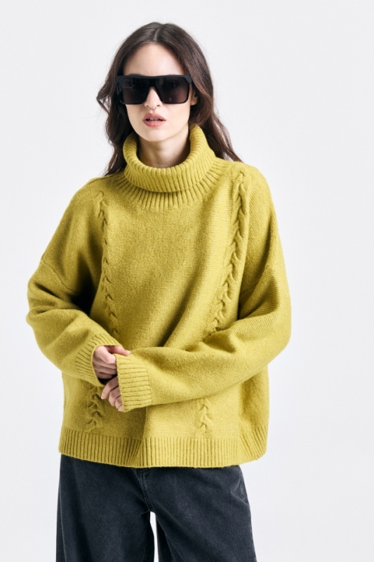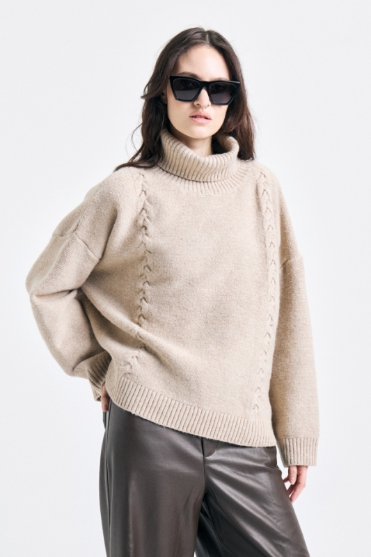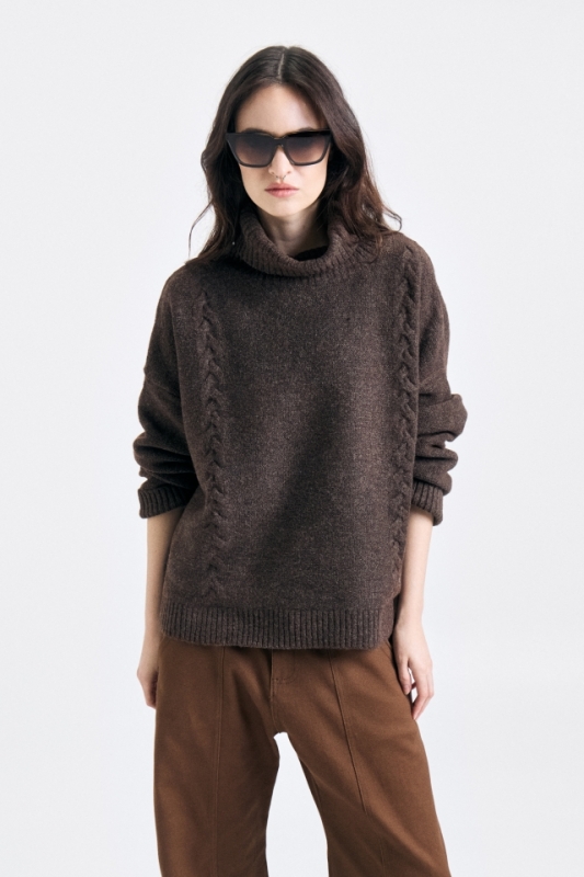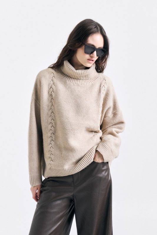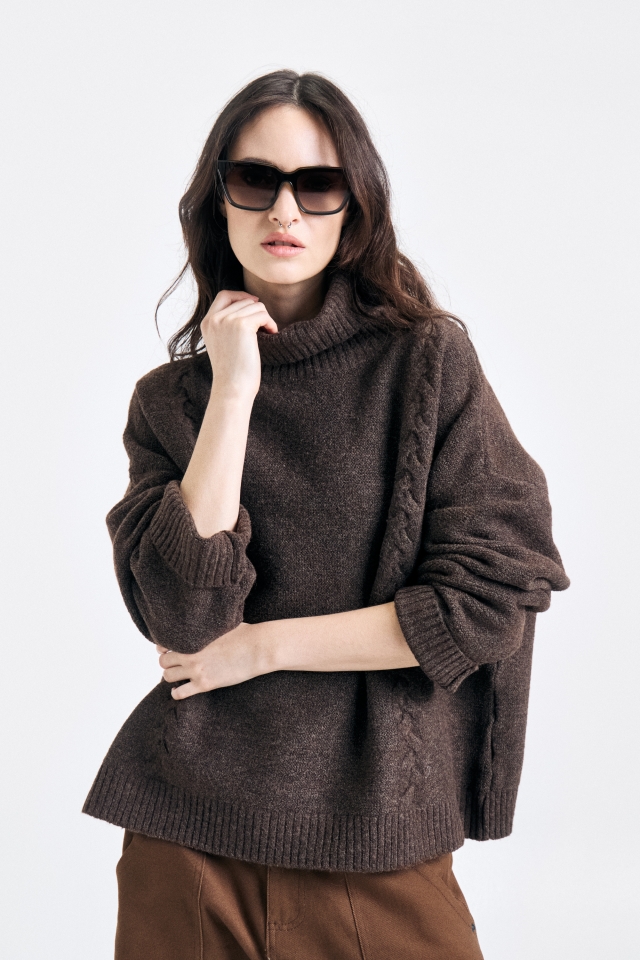 Sweater tejido de calce relajado, con cuello polera y detalle trenzado.Composición: 61% poliester 15% nylon 15% acrílico 6% lana 3% spandexHECHO EN CHINA
